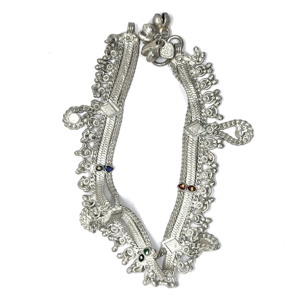 Celebrate expressive style with this captivating pair of German silver anklets. Each anklet is constructed from solid, linked panels, richly detailed with intricate engraved motifs and accented with pops of colorful beadwork. A delicate fringe of tiny sound bells adds a gentle, musical chime to your every step, enhancing their bohemian charm. The deeply oxidized finish gives this pair a stunning, vintage tribal-inspired look. A bold and artful accessory, these anklets are perfect for adding a touch of rustic flair to any ensemble.