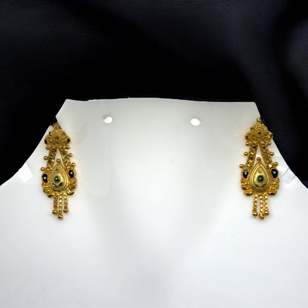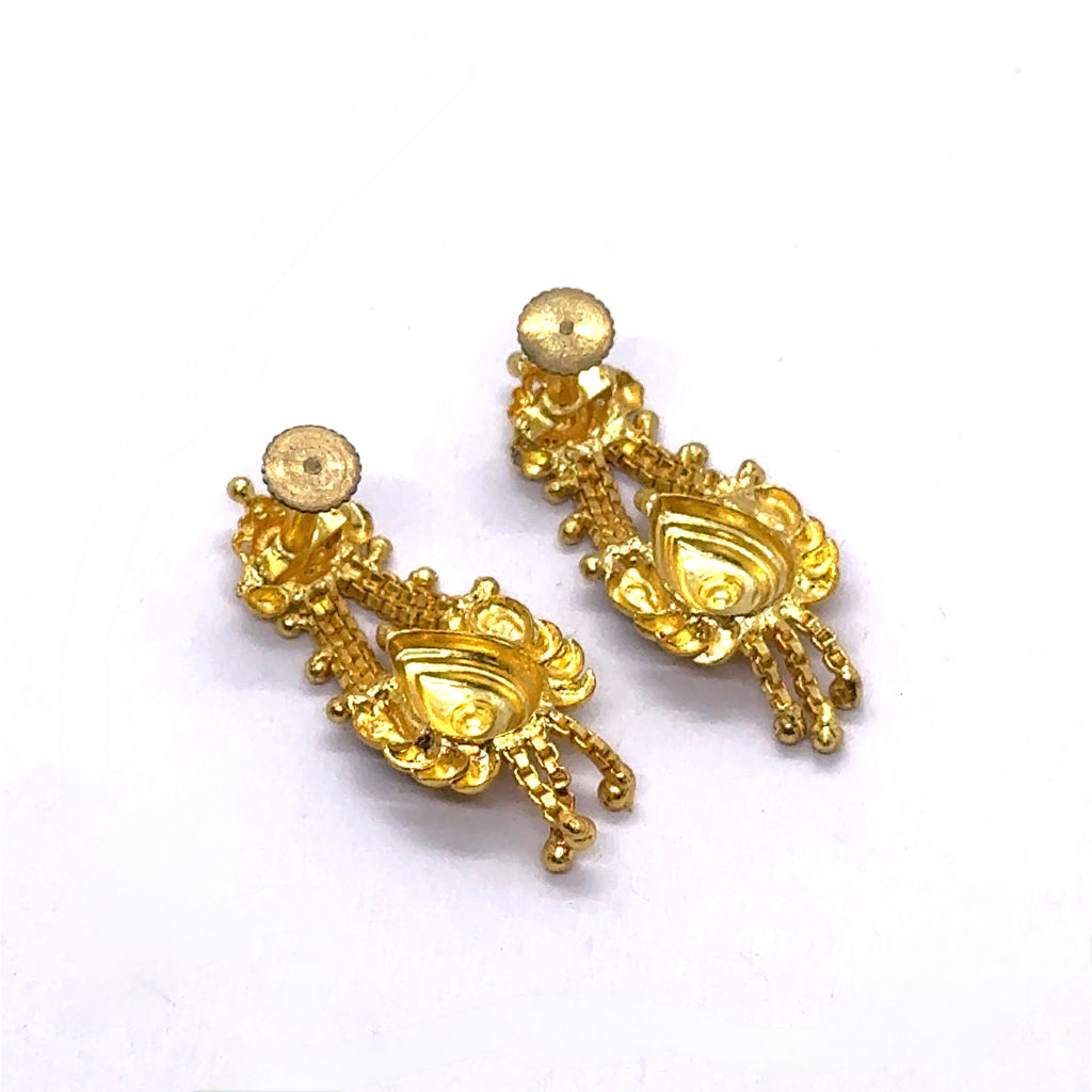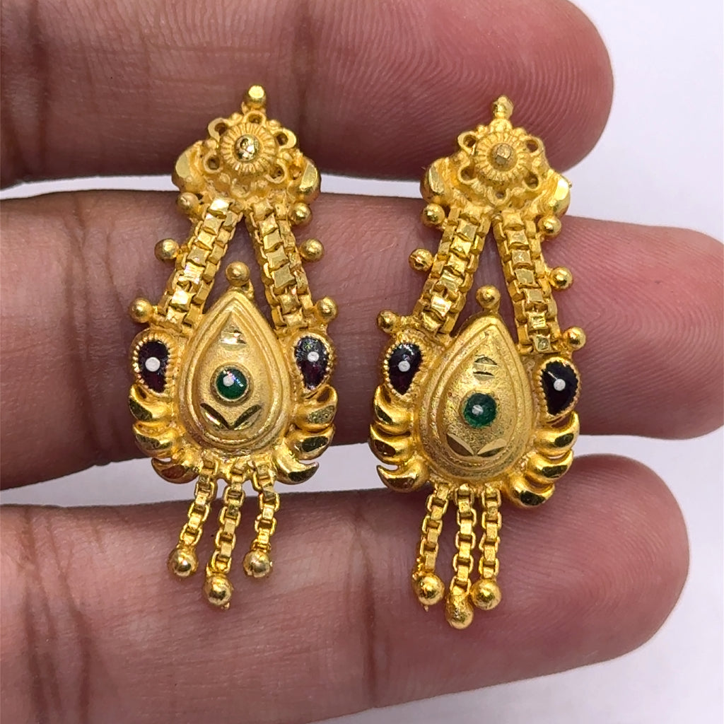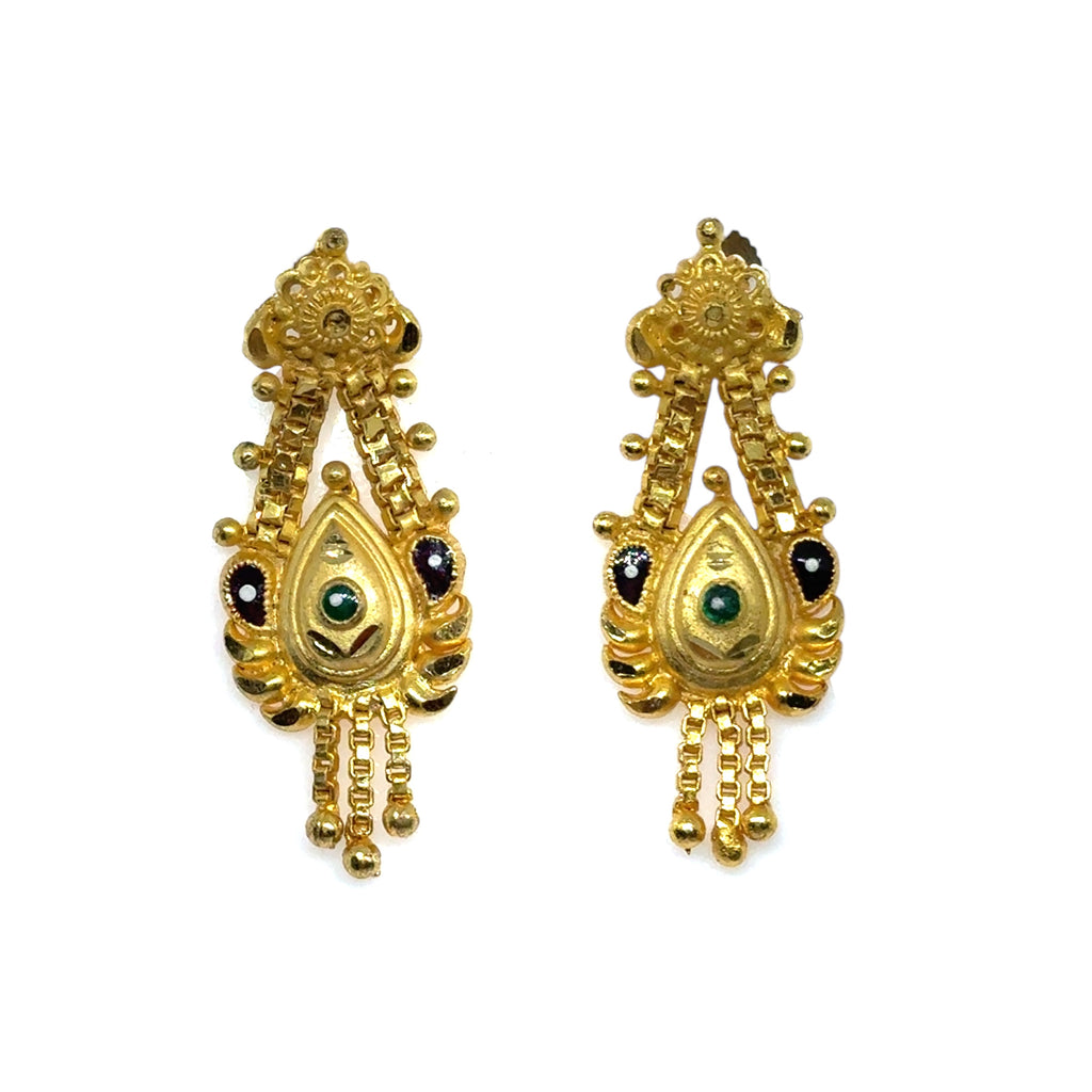 Evoking the form of a peacock feather, these earrings feature a floral top and teardrop-shaped engraved center with colored enamel accents. Elegant yet festive, perfect for statement styling.