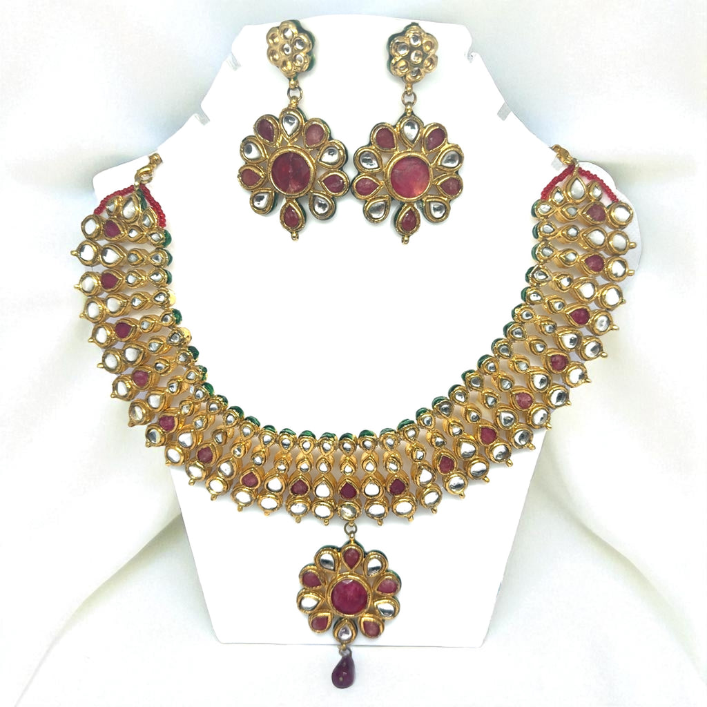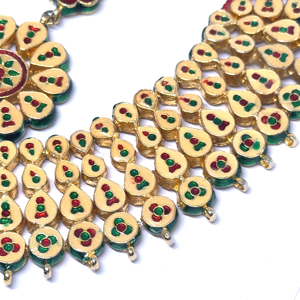 Celebrate timeless Indian elegance with this Traditional Kundan Pattern Meenakaari Gold-Plated Jewelry Set, featuring a necklace and matching earrings crafted with meticulous detail. The Kundan stones and vibrant Meenakaari enamel work reflect heritage artistry and traditional craftsmanship, creating a striking and colorful design.