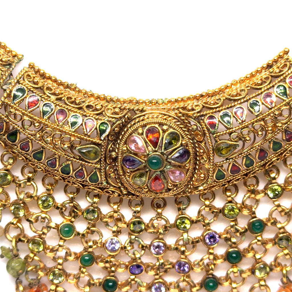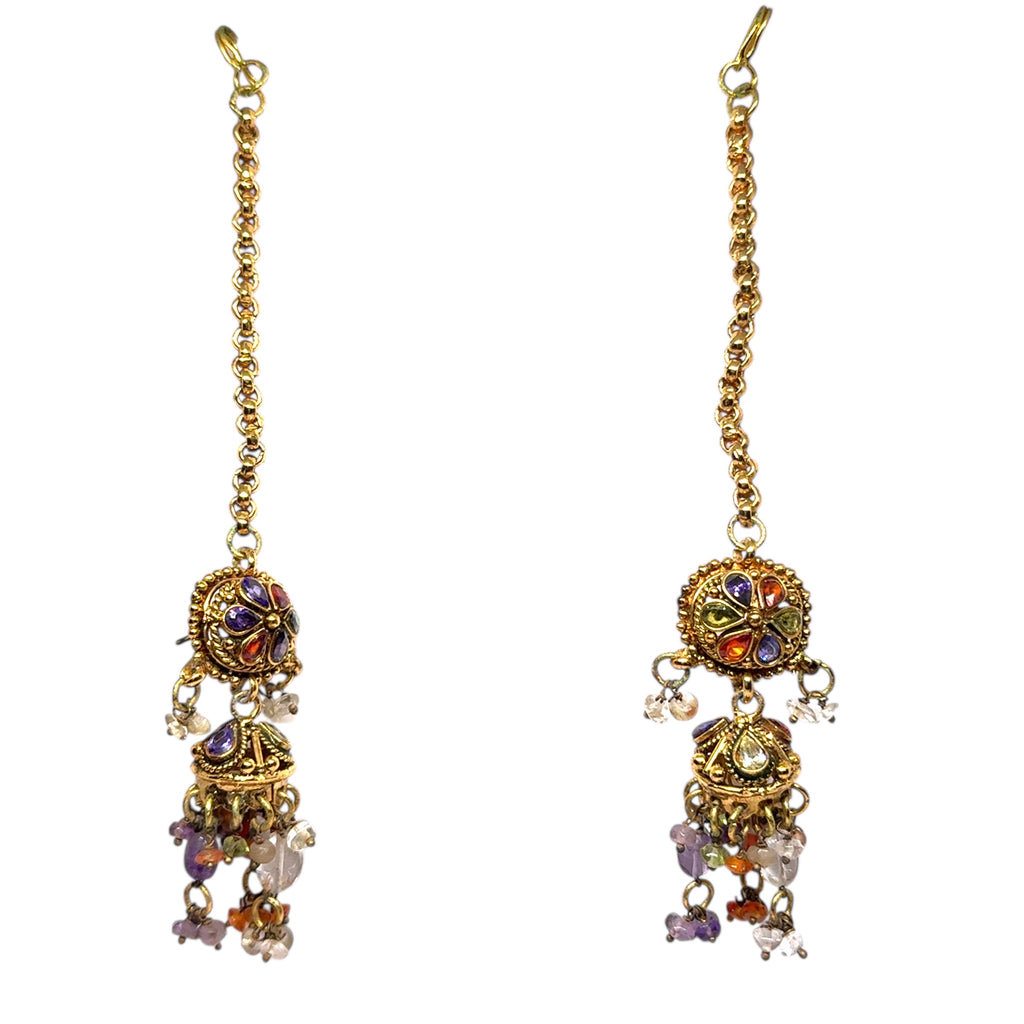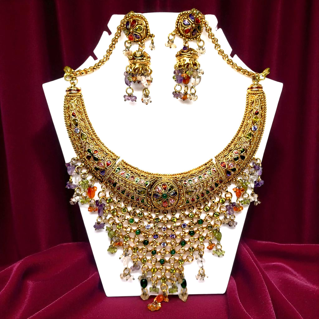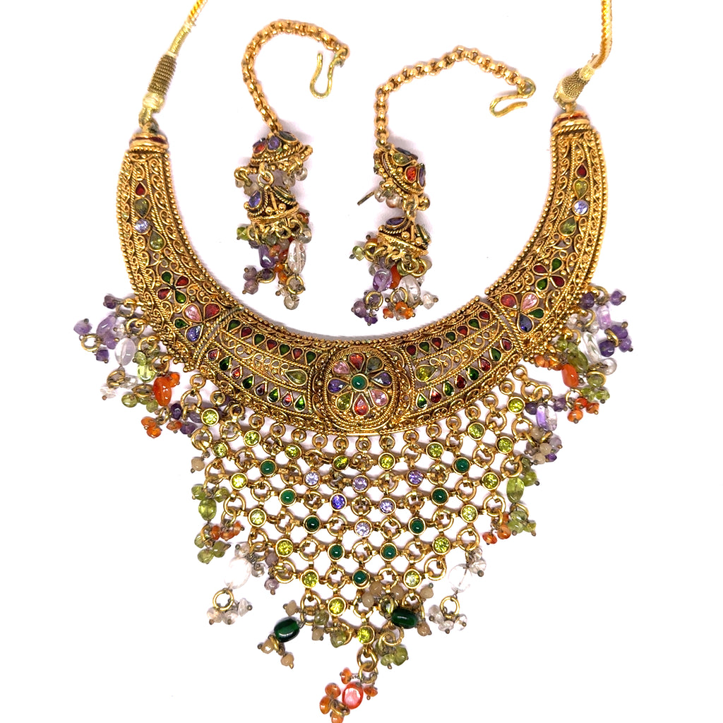 The gold-plated finish enhances the rich design details, while the jhumka and ear chains add a graceful, flowing charm that elevates any look. Perfect for weddings, festive occasions, or special celebrations, this jewelry set exudes royal allure and enduring beauty, making it a treasured addition to any collection.
