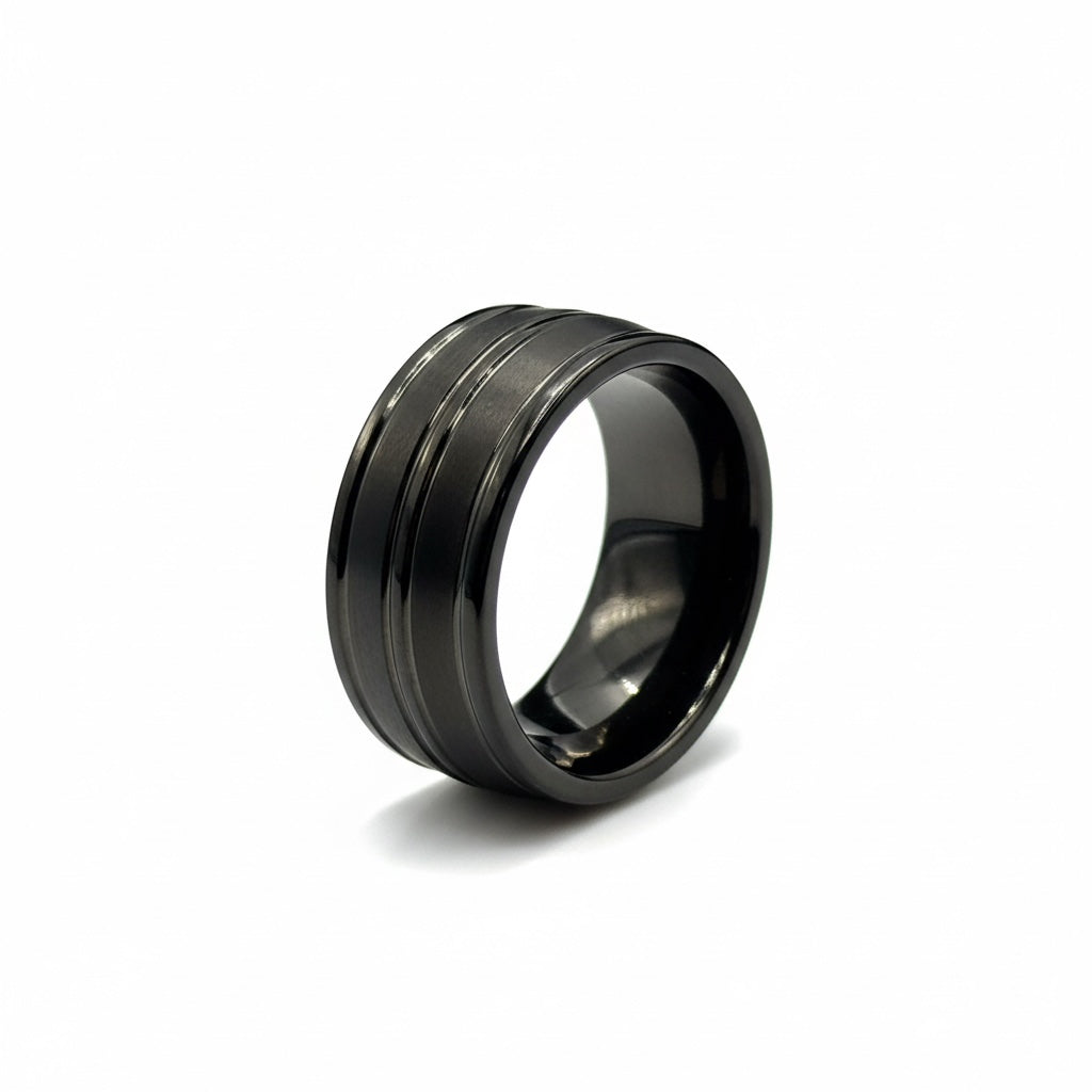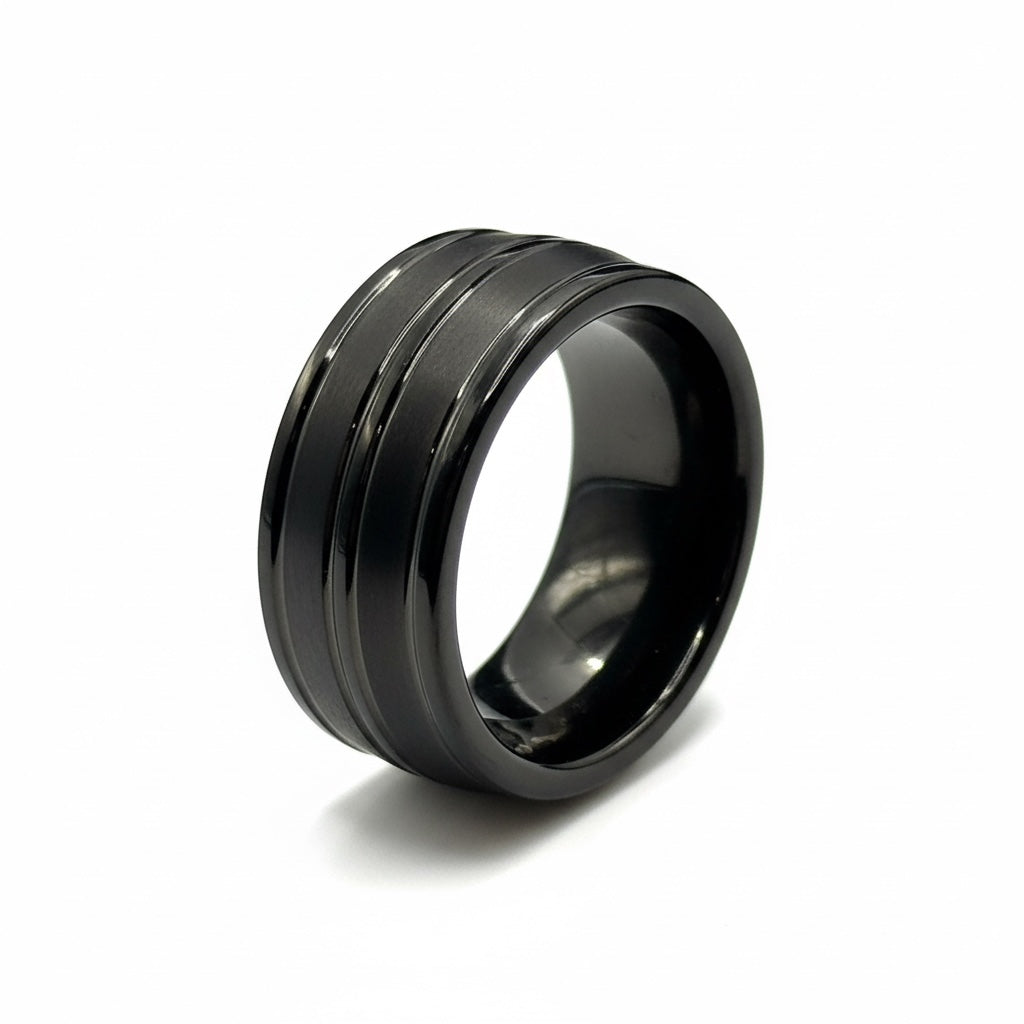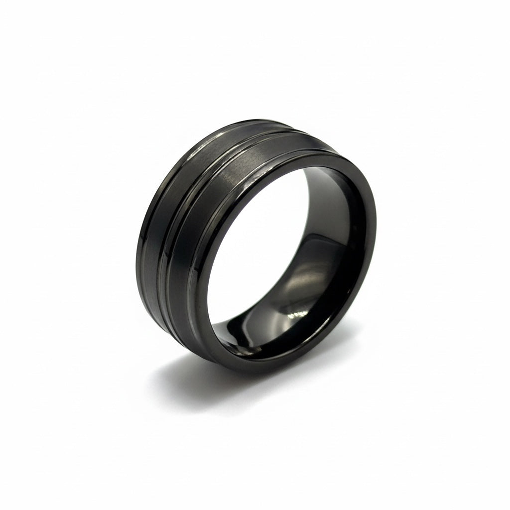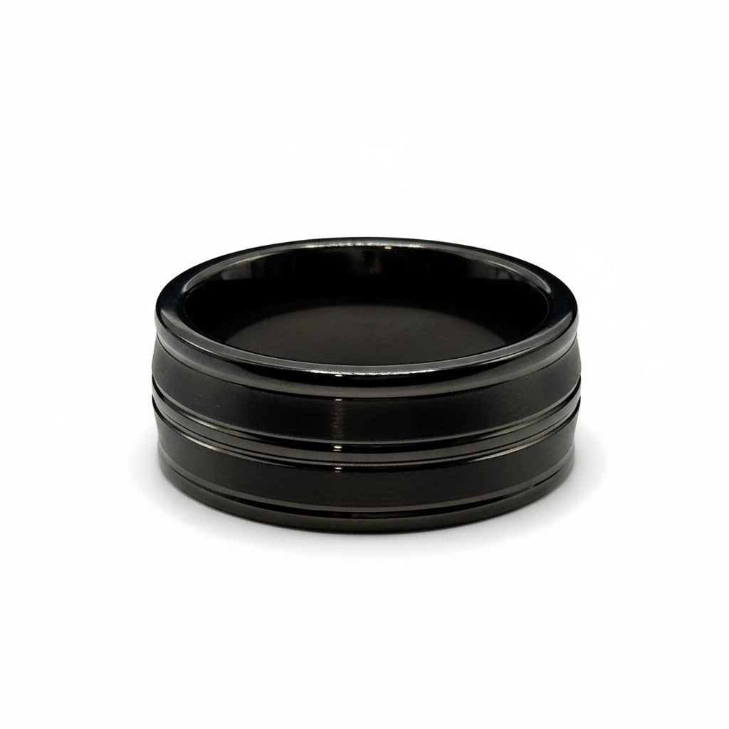 JEWELNJOY's flat black tungsten band with a polished grooved center mixes brushed and glossy textures for a sharp, sporty look with modern edge.