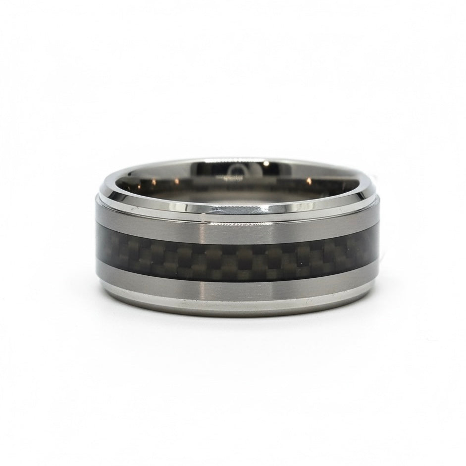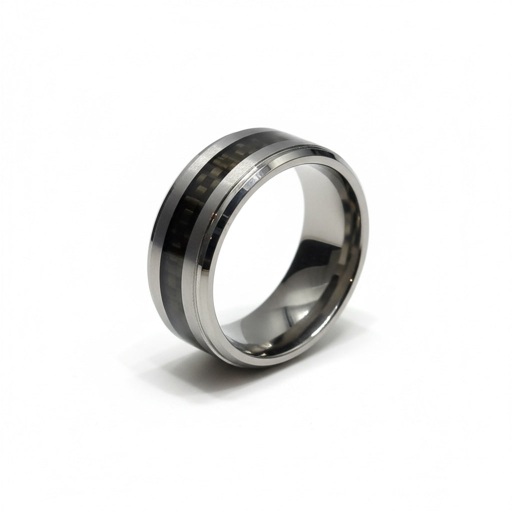 JEWELNJOY's carbon-fiber inlay tungsten band with silver beveled edges gives a sporty-luxury vibe—clean contrast, sharp detail, and premium feel.