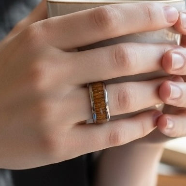 JEWELNJOY's domed wood-inlay tungsten band pairs warm natural tones with silver high polish and beveled edges for a premium, nature-inspired finish.