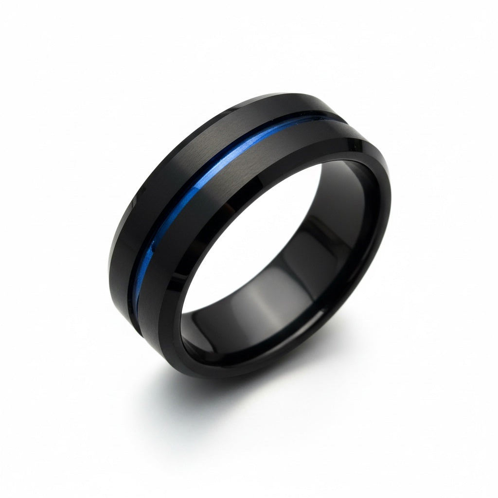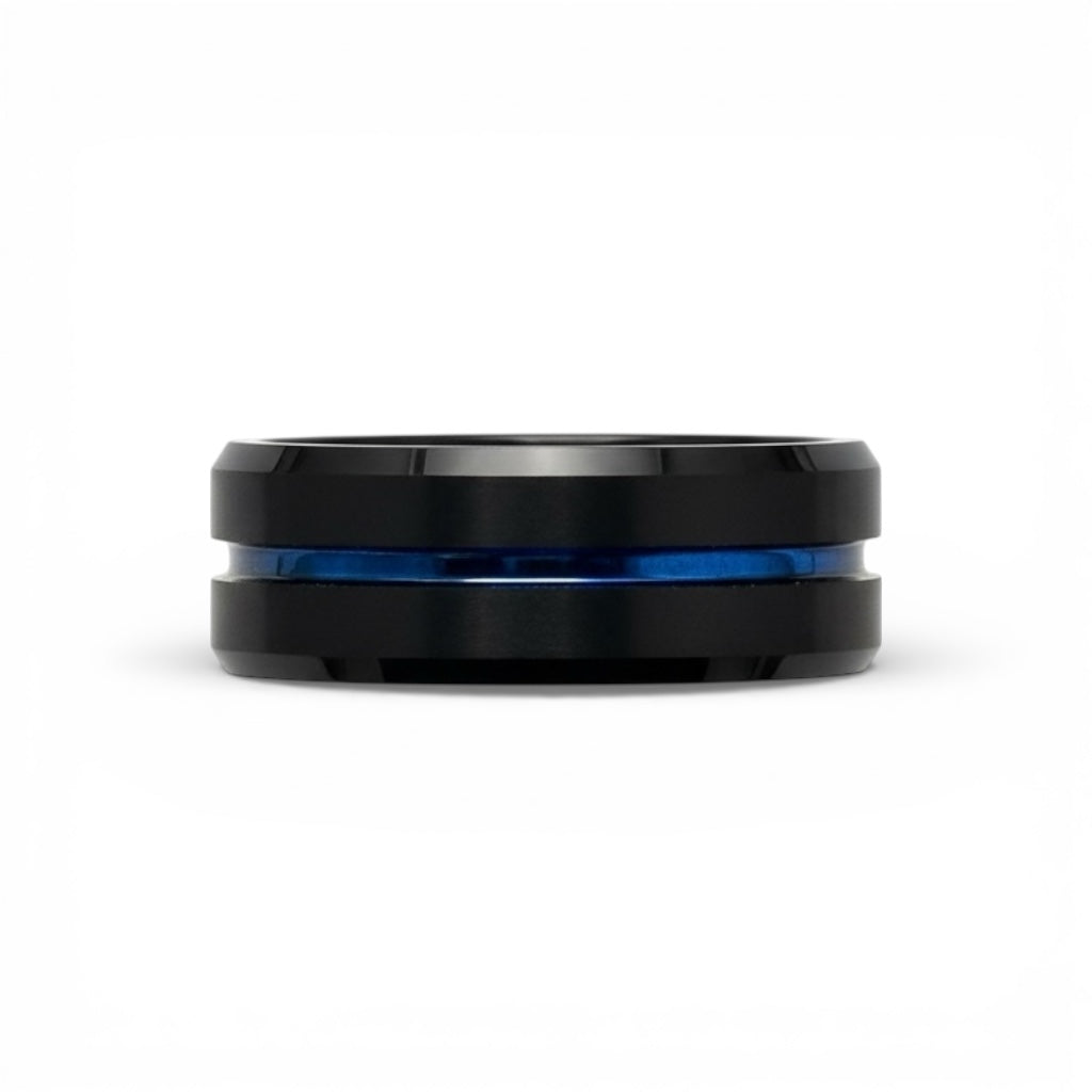 JEWELNJOY's Thin Blue Line tungsten band features a recessed blue stripe on a black brushed finish, finished with beveled edges for a clean, meaningful statement.