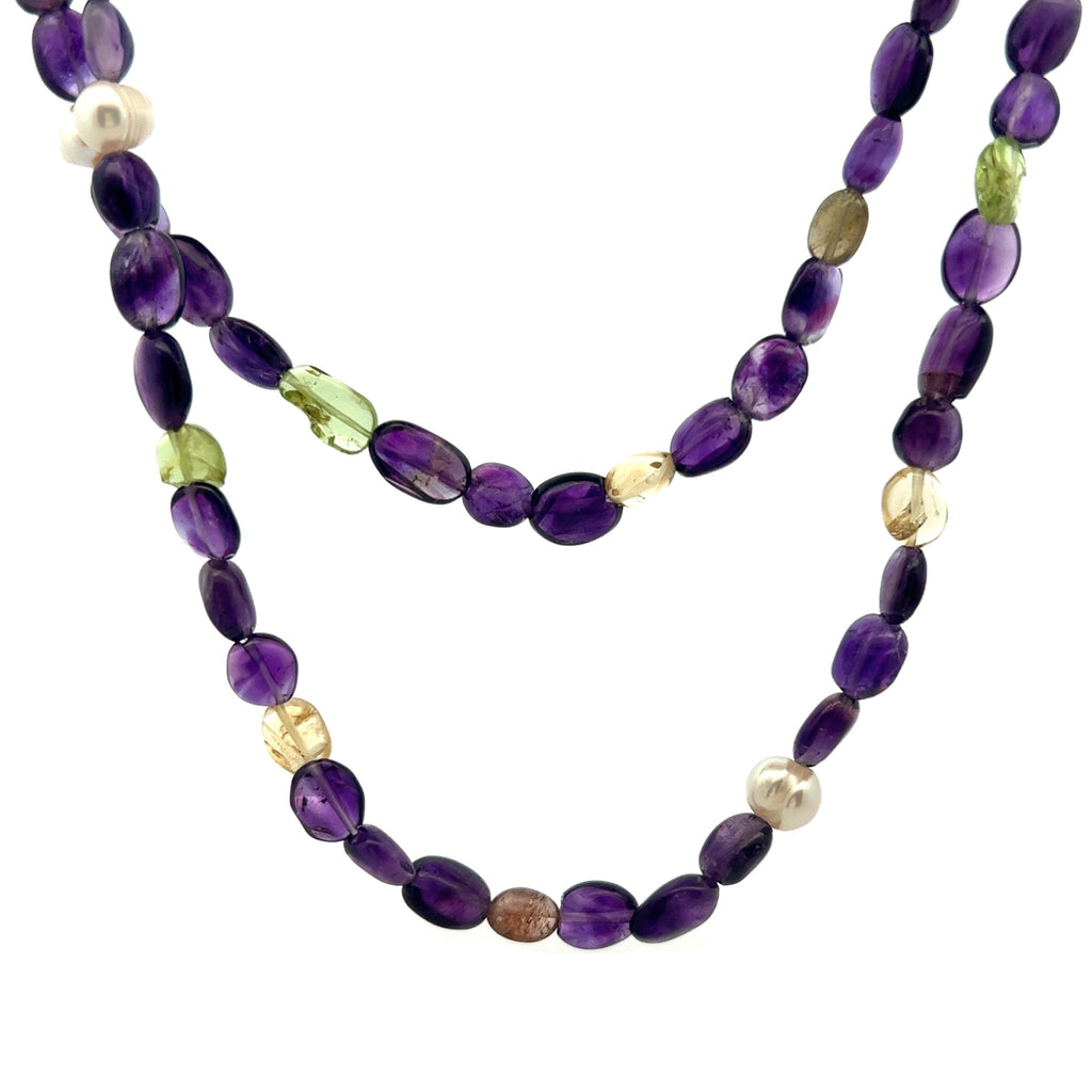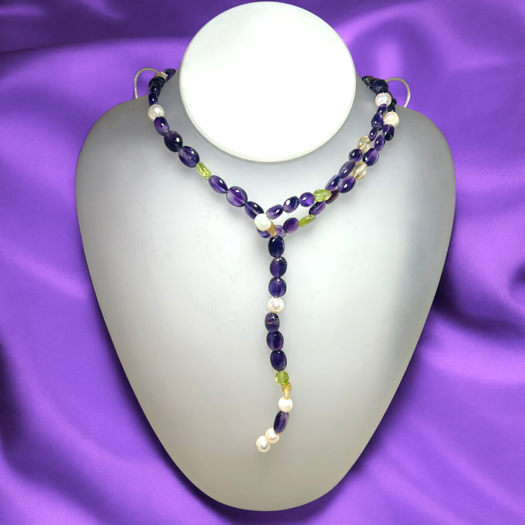 Natural Amethyst Peridot Citrine Tourmaline Pearl Layered Semiprecious Necklace