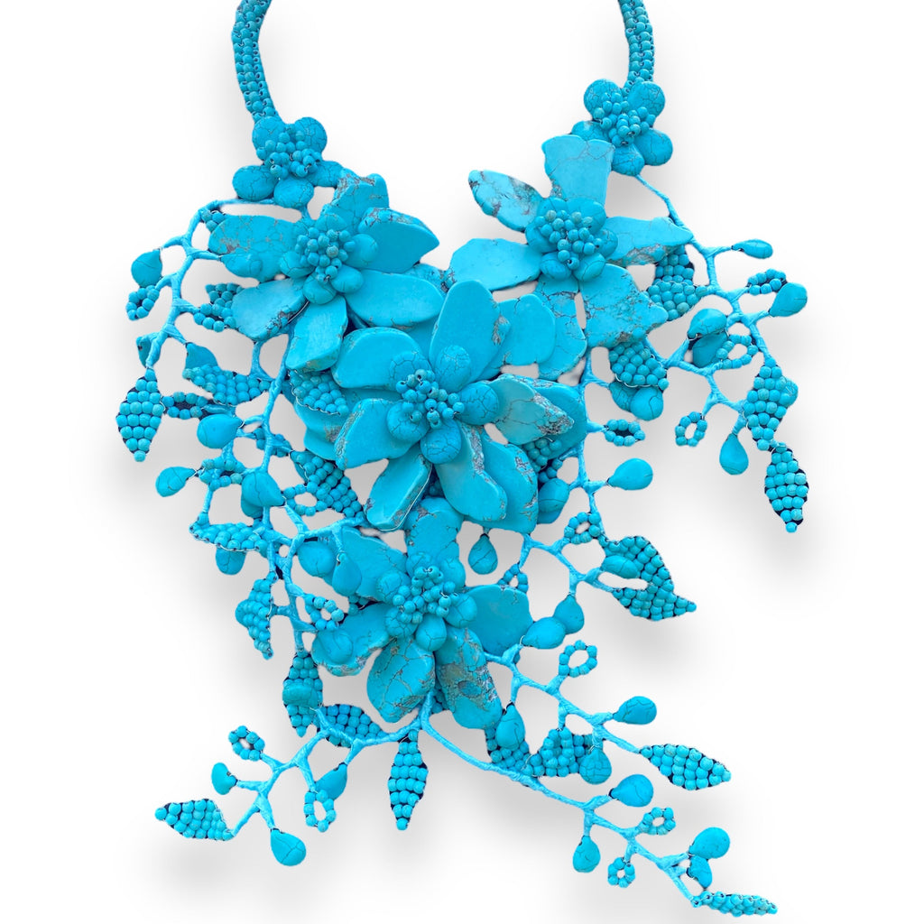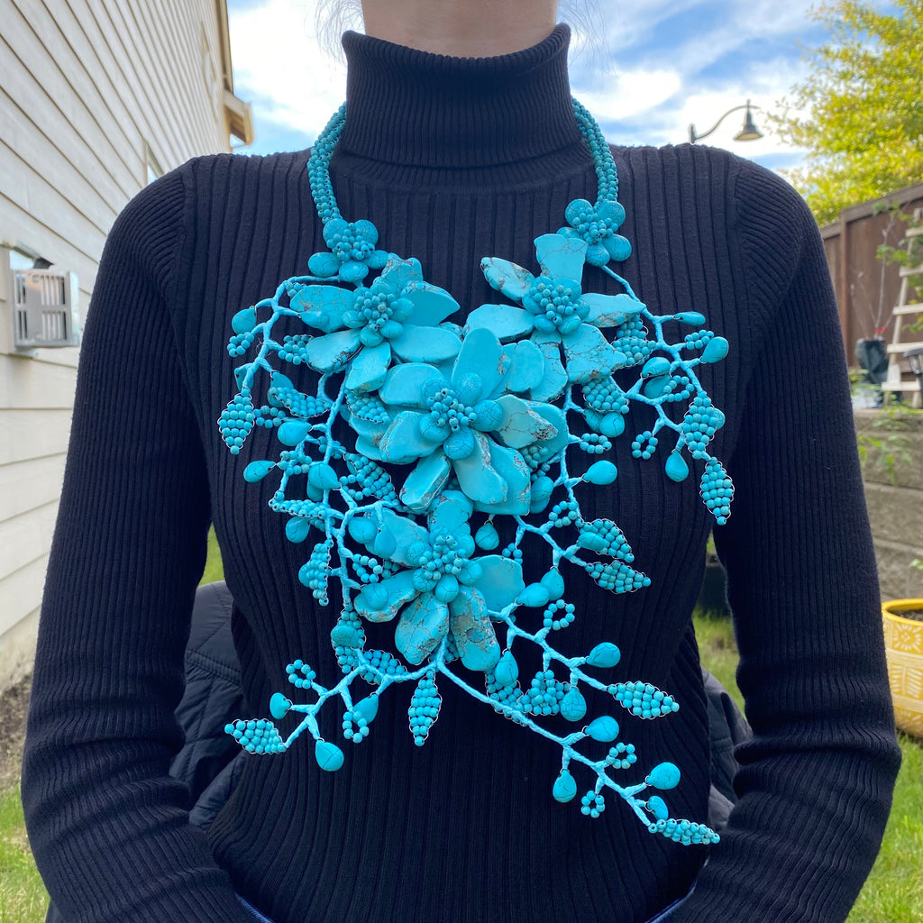 Handmade Statement Necklace 22" Creeping Turquoise Floral Cluster Body Necklace