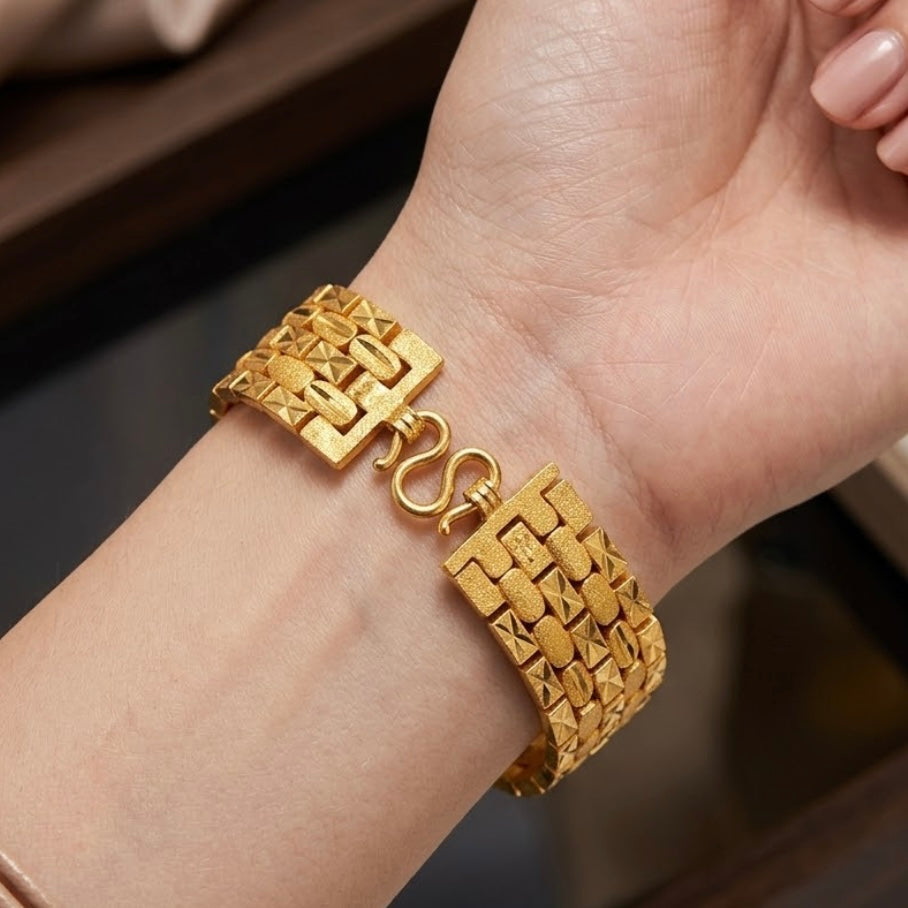 Each geometric link is crafted with subtle surface texture, adding depth and contrast to the bracelet’s smooth, reflective segments. The micron gold plating enhances its rich luster, offering a finish that is both luxurious and long-lasting.