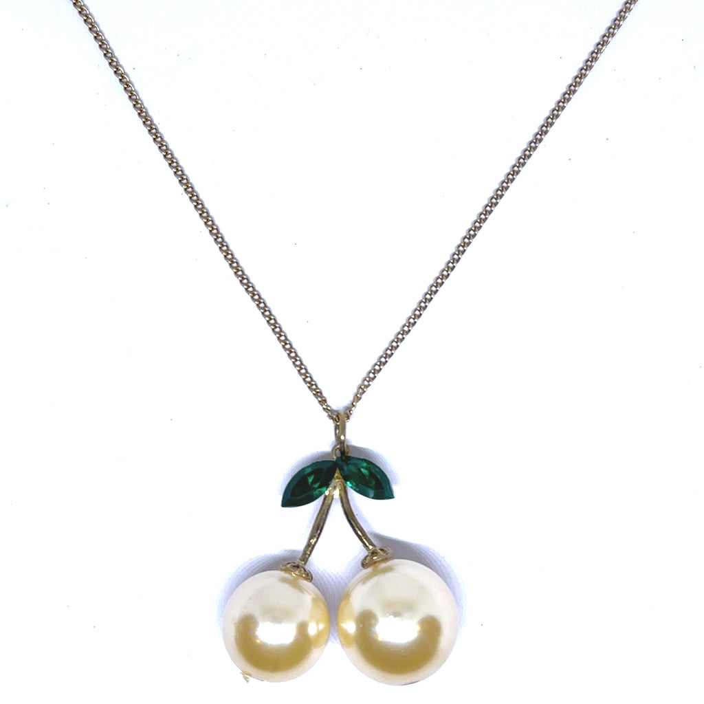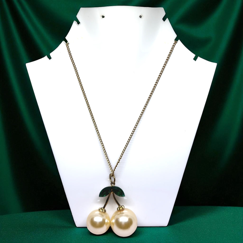 Nature-inspired necklace designed with yellow gold plated leaves. It showcases two simulated pearls alongside green-created stones, blending a delicate and ethnic jewelry style. This pendant necklace serves as a fashionable accessory perfect for various occasions, emphasizing both elegance and a connection to nature.