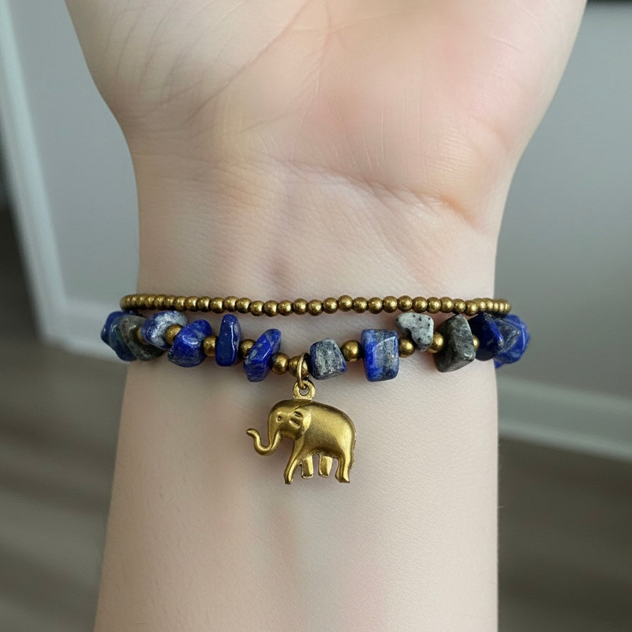 Celebrate wisdom and inner truth with this captivating handcrafted lapiz beaded bracelet. Rich blue lapiz chips with subtle golden pyrite flecks are layered with small golden seed beads on adjustable cords, creating a deep, regal boho-inspired design. A golden elephant charm-symbolizing strength, wisdom, and good fortune-dangles gracefully alongside tiny bells that produce a soft, enchanting jingle with every movement. The sliding knot closure ensures a comfortable, customizable fit for most wrist sizes, making it perfect for everyday wear or layering with other bracelets. Made with natural lapiz, revered for enhancing intuition and clarity, this bracelet brings depth, positivity, and a touch of mystical elegance to any outfit-ideal as a unique thoughtful gift.