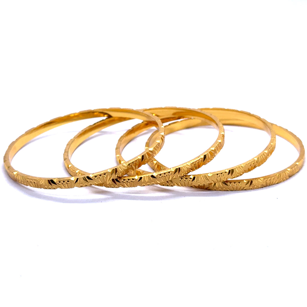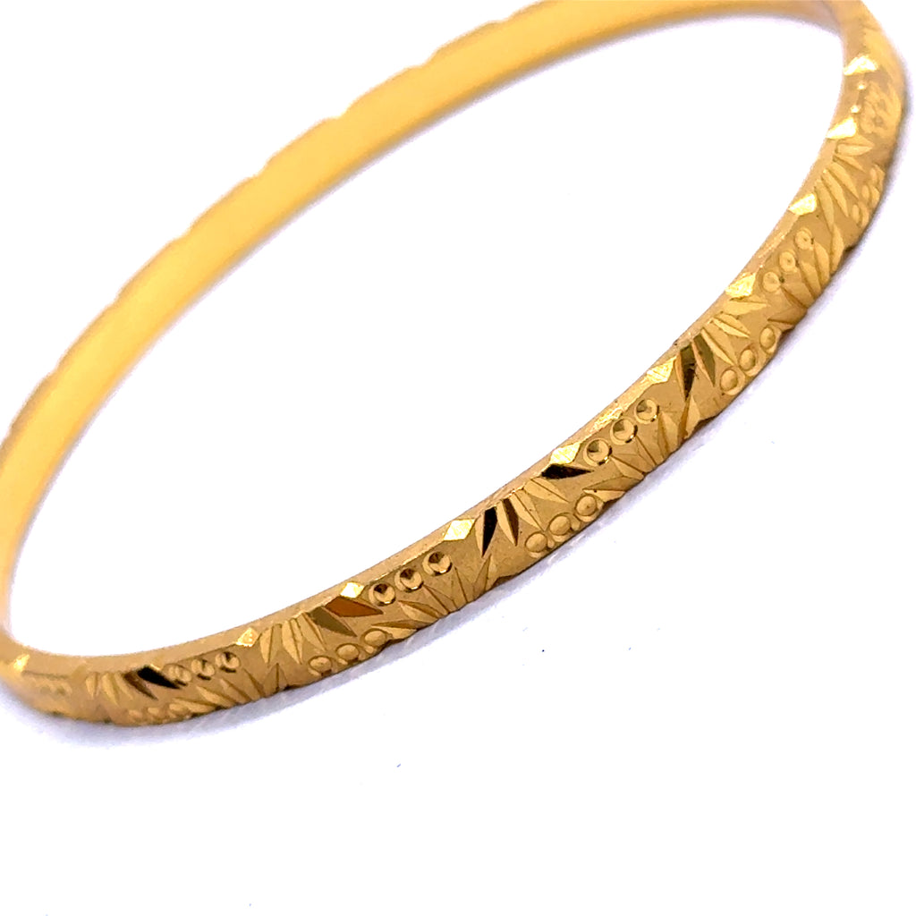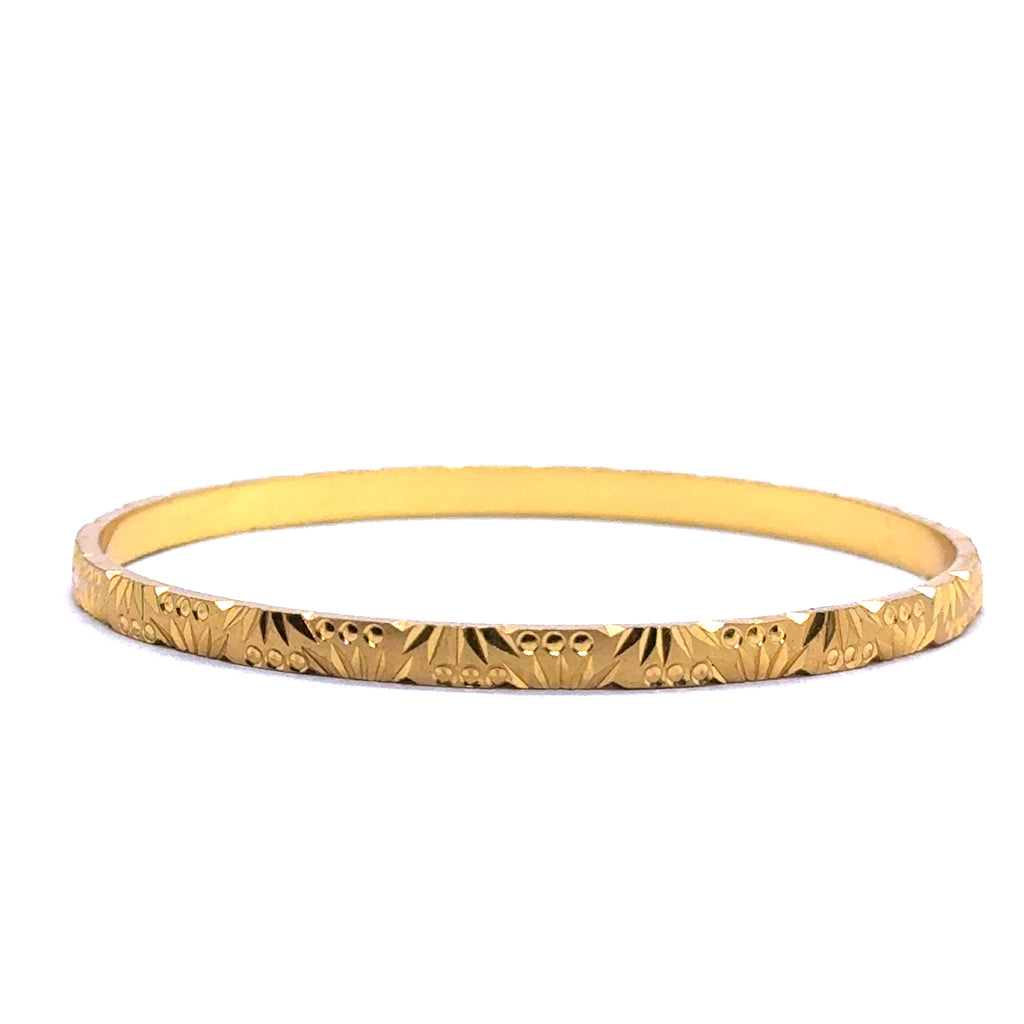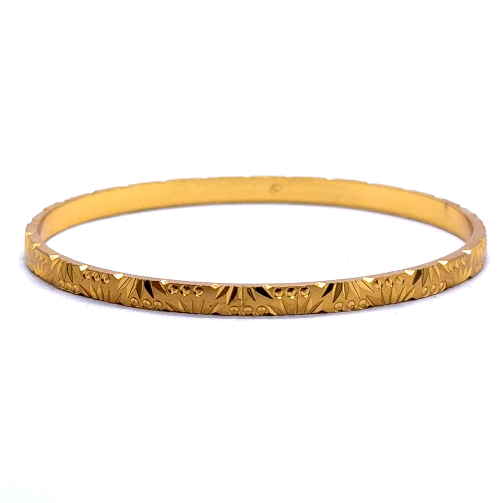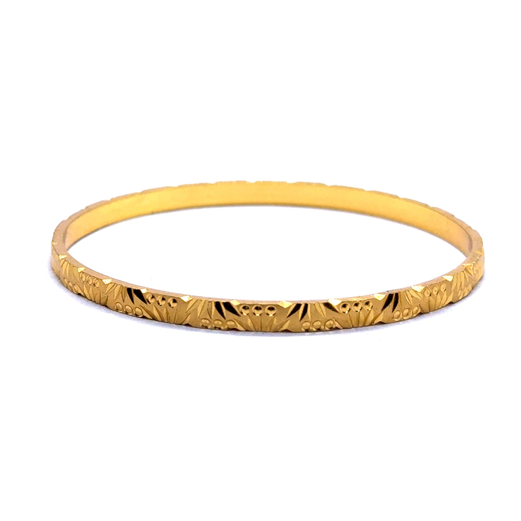 Celebrate a beautiful blend of modern elegance and traditional artistry with this unique gold-plated bangle. A sleek, polished band is artfully punctuated by segments of intricate, geometric engravings, creating a stunning contrast between the smooth, high-shine finish and the rich, heritage-inspired texture of the motifs. Its understated yet distinctive design makes this piece incredibly versatile. It's perfect as a sophisticated standalone accessory or for adding a touch of patterned elegance to a modern bangle stack, making it a cherished addition to any collection.