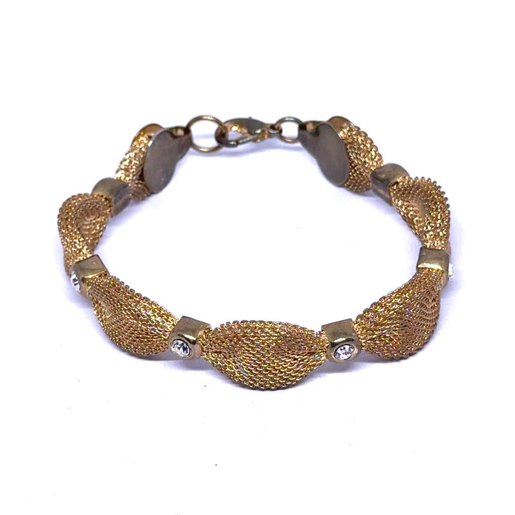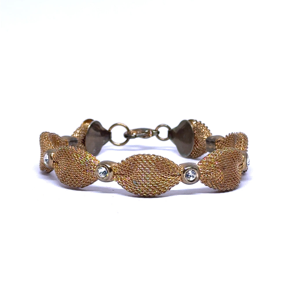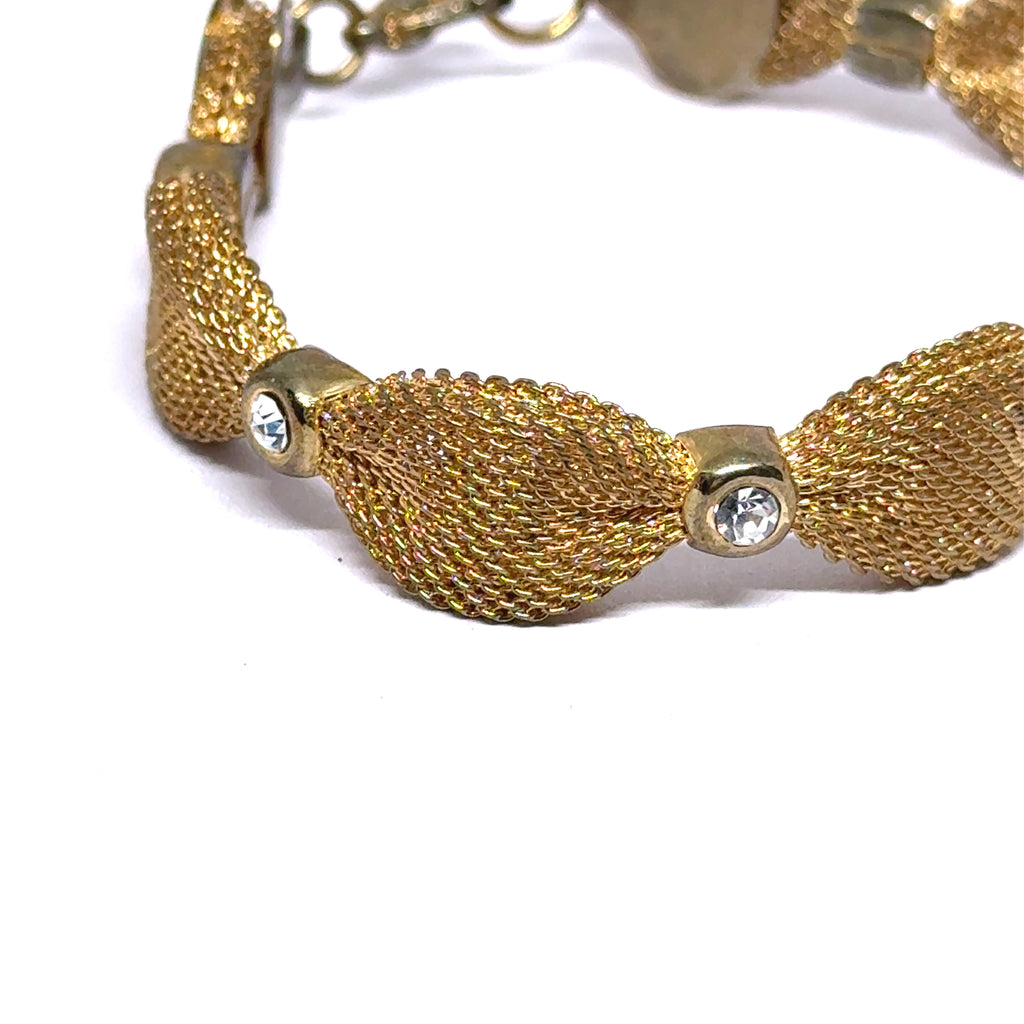 Celebrate the elegance of vintage artistry with this Woven Gold-Tone Mesh Bracelet, a captivating piece that blends delicate texture with sparkling detail. Designed with a beautifully braided mesh band, the bracelet features rhinestone-studded marquise links that bring a touch of glamour to its timeless structure.