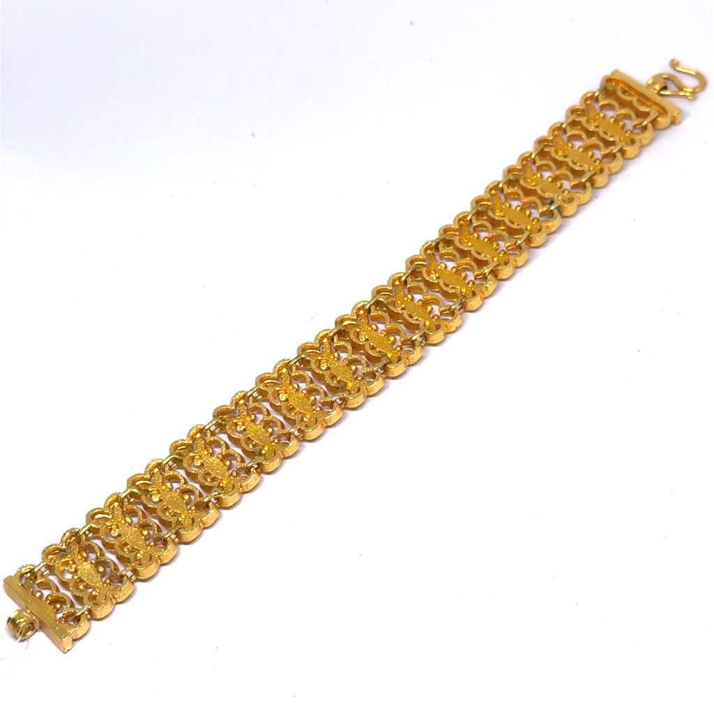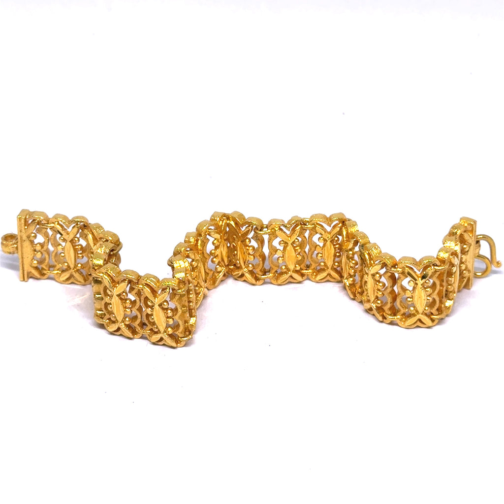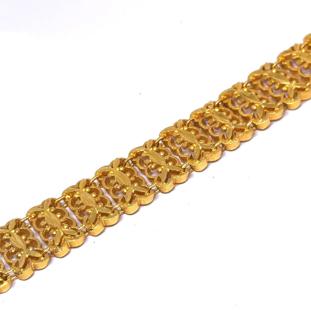 Each leaf-shaped link is carefully textured to capture the subtle veins and curves found in real foliage, while the filigree detailing adds a layer of lace-like intricacy that enhances its graceful charm. The rich gold plating brings a warm, radiant glow, elevating the bracelet with a touch of timeless sophistication.