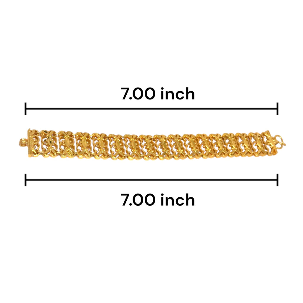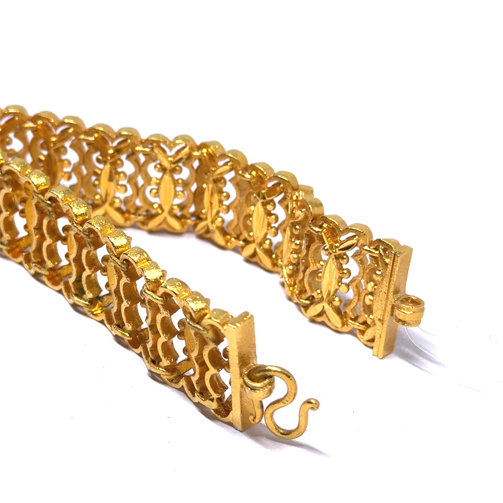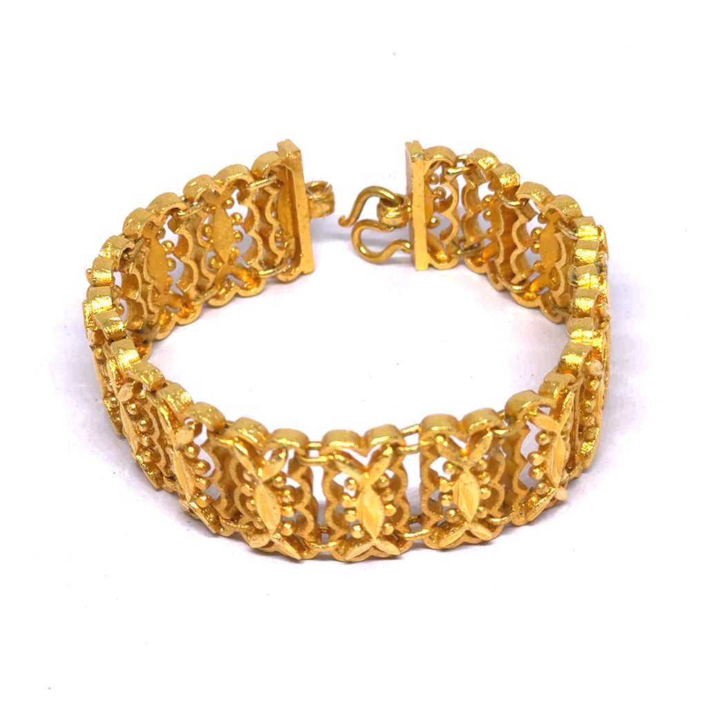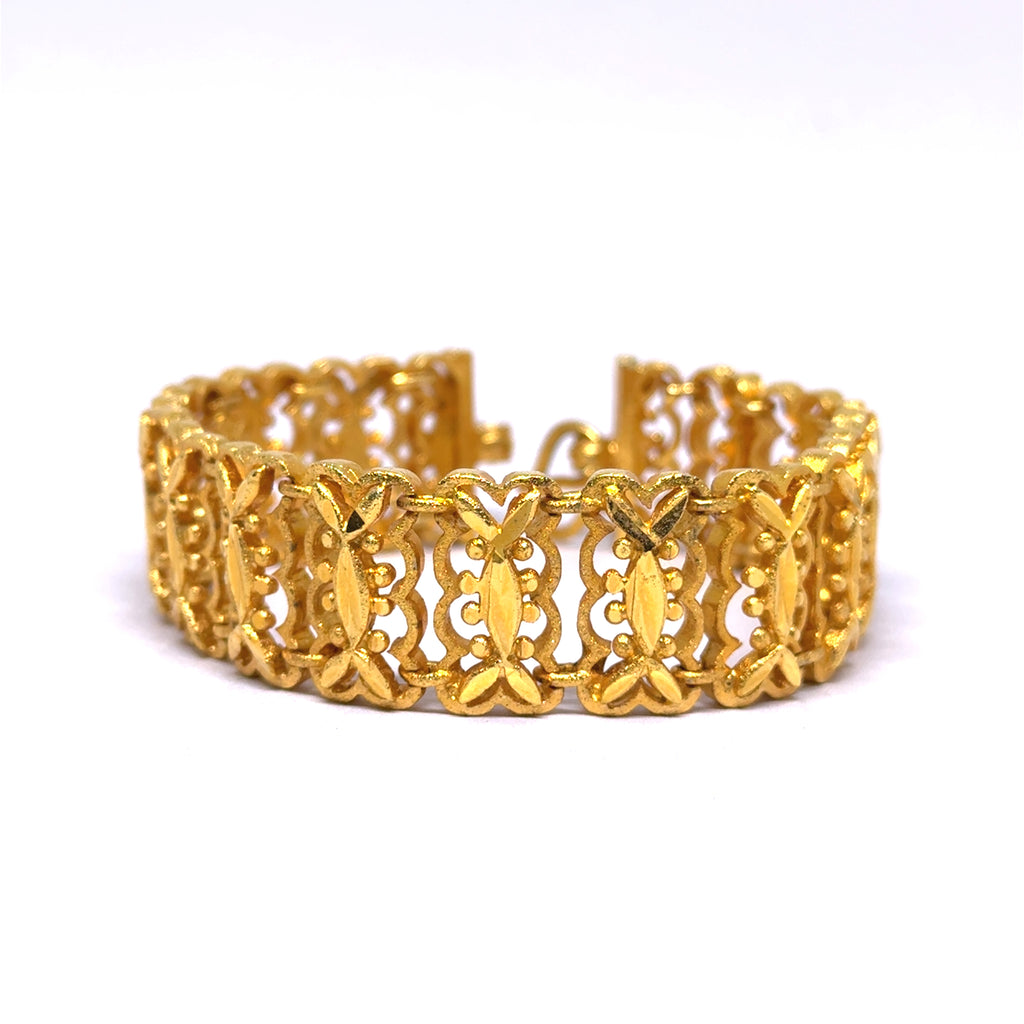 Each leaf-shaped link is carefully textured to capture the subtle veins and curves found in real foliage, while the filigree detailing adds a layer of lace-like intricacy that enhances its graceful charm. The rich gold plating brings a warm, radiant glow, elevating the bracelet with a touch of timeless sophistication.