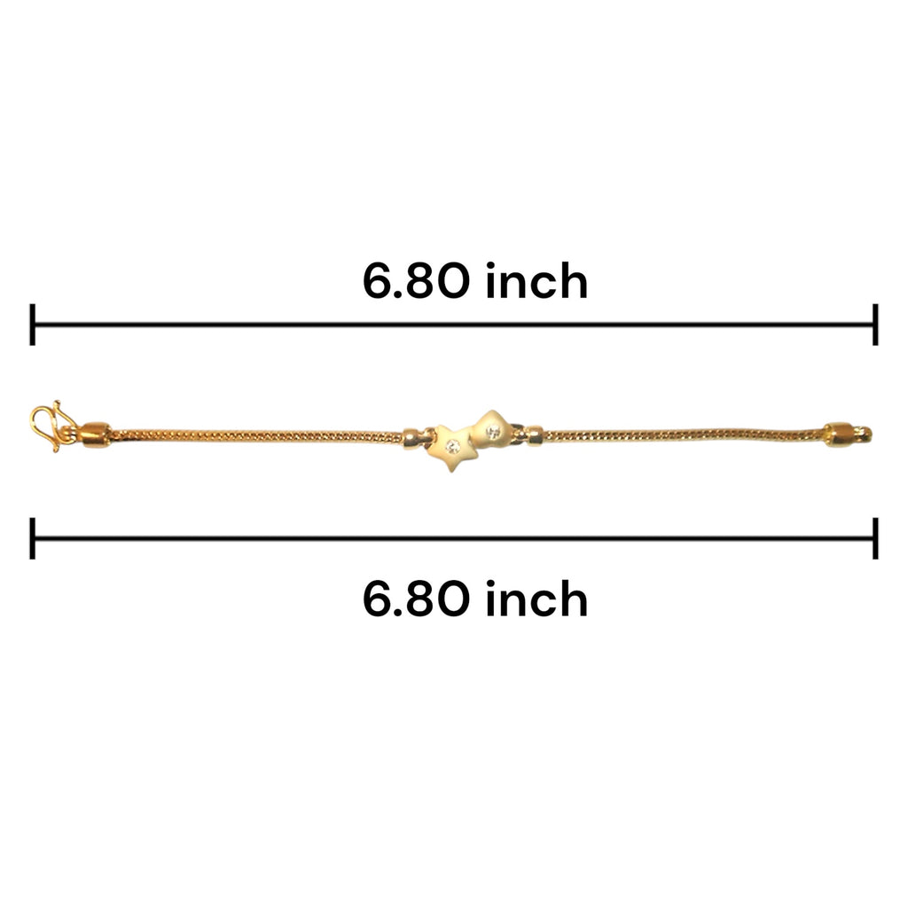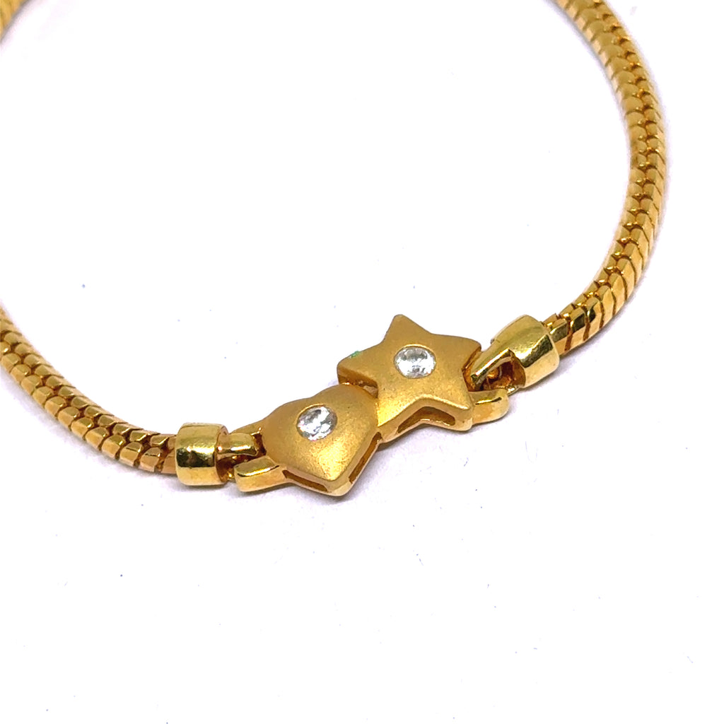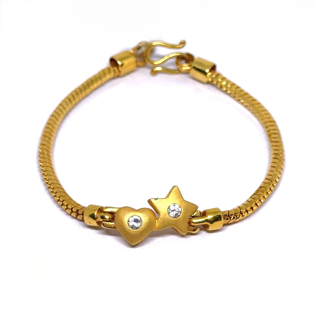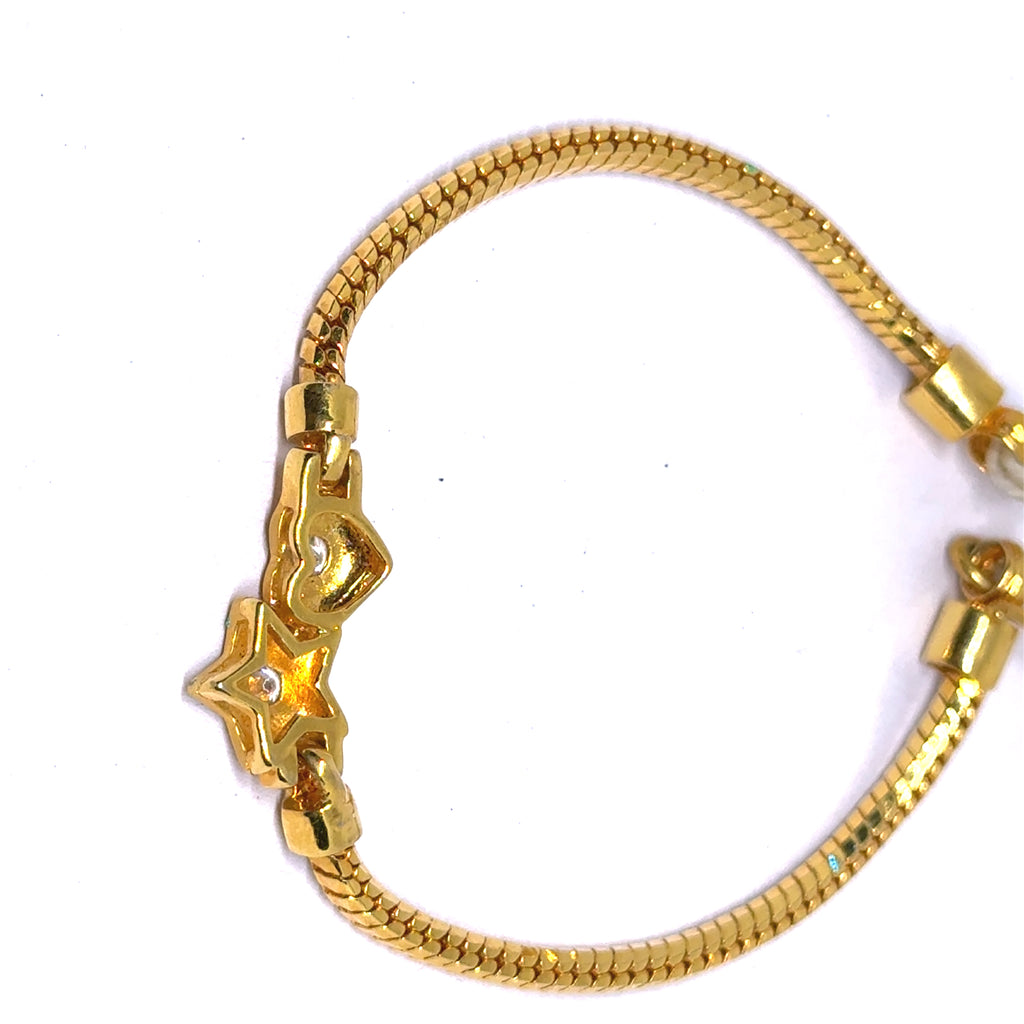 The snake chain design offers a smooth, fluid silhouette, finished in high-shine micron gold plating that adds a touch of luxury and durability. Dangling along the bracelet, the cubic zirconia–studded heart and star charms glisten with every movement, creating a look that’s both delicate and eye-catching.