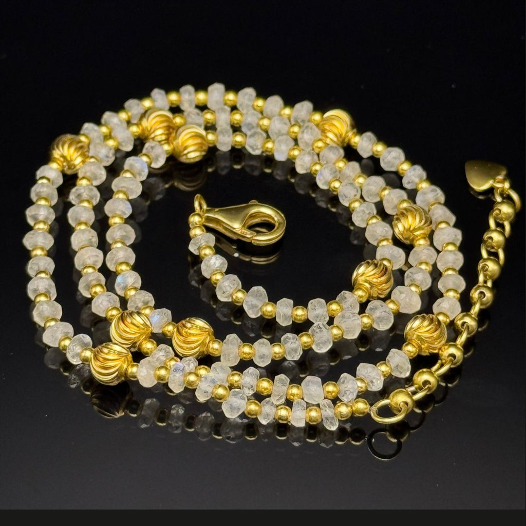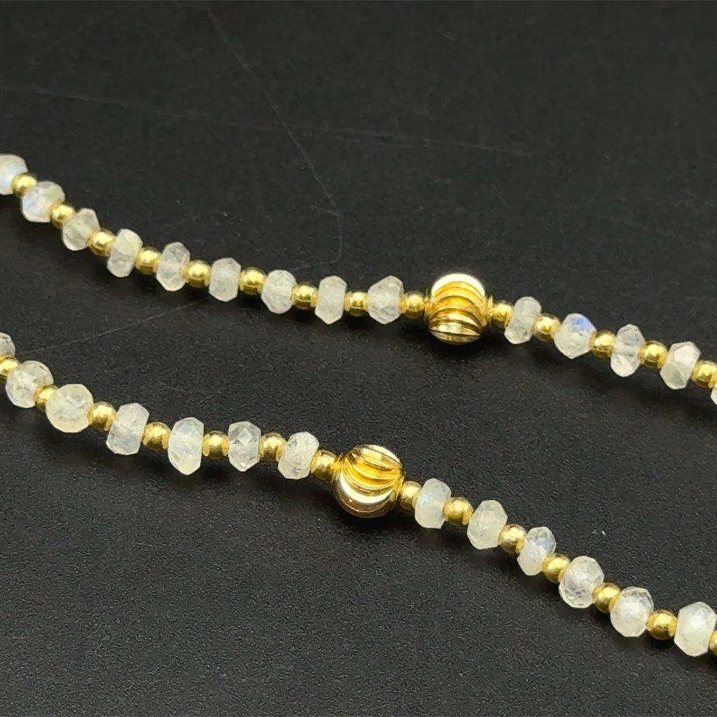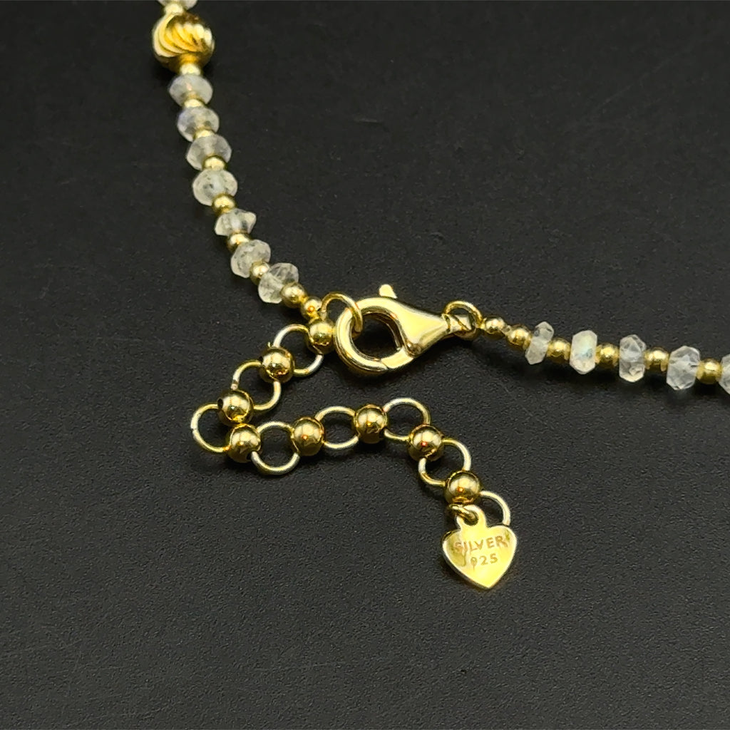 Celebrate the ethereal glow of June's birthstone with this mesmerizing 925 sterling silver station necklace adorned with natural Moonstone faceted rondelle beaded gemstones and shimmering gold charms. Embracing the mystical properties of Moonstone, the traditional June birthstone, this necklace symbolizes intuition, emotional balance, and feminine energy, making it a perfect talisman for personal growth and serenity. The luminous, iridescent sheen of the faceted rondelle beads captures light with subtle blue flashes, paired with gold-plated stations for a touch of elegance and sophistication. Versatile for everyday wear, layering, or special occasions, this handcrafted piece from JEWELNJOY complements bohemian, minimalist, or classic styles, and serves as an ideal birthday gift for June-born loved ones. Made from genuine 925 sterling silver for tarnish-resistant durability and hypoallergenic comfort, it's a timeless gemstone accessory that blends natural beauty with meaningful symbolism.