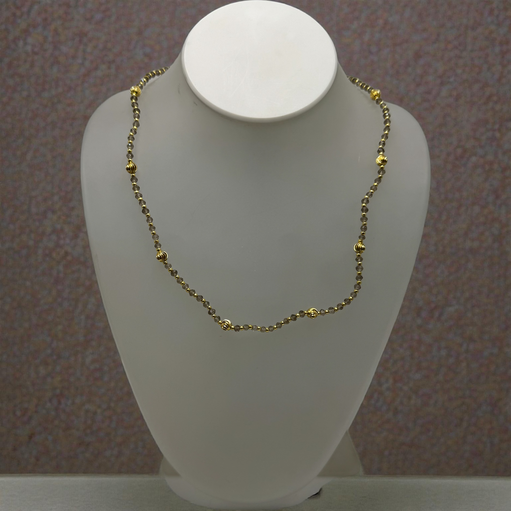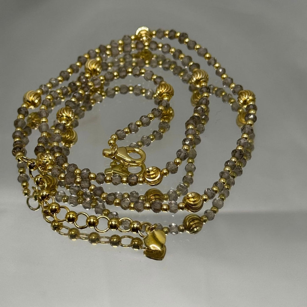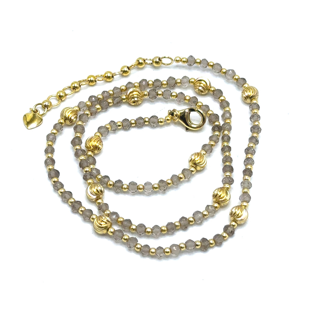 Celebrate grounding energy and timeless style with this exquisite 925 sterling silver station necklace, featuring natural Smoky Quartz faceted rondelle beads and elegant gold charms. Known as a powerful grounding stone, Smoky Quartz is revered for its ability to dispel negativity, promote emotional calmness, and foster a sense of stability and protection in daily life. This handcrafted piece showcases a delicate silver chain adorned with translucent gray-brown Smoky Quartz gems, interspersed with shiny gold ball charms for a luxurious contrast that adds warmth and sophistication. Ideal for those seeking balance and resilience, this versatile necklace pairs beautifully with everyday outfits or evening ensembles, offering both aesthetic appeal and metaphysical benefits. Made from premium, hypoallergenic 925 sterling silver for lasting comfort and durability, it includes a secure lobster clasp for easy wear. Whether as a meaningful gift for loved ones or a personal talisman, this boho-inspired gemstone accessory elevates your jewelry collection.