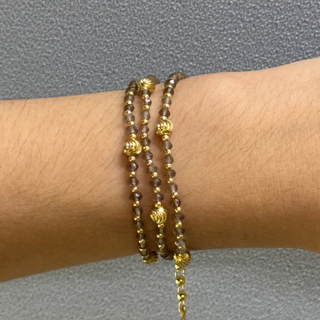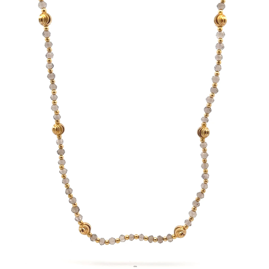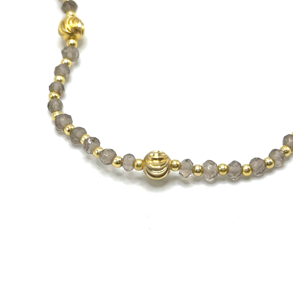Celebrate grounding energy and timeless style with this exquisite 925 sterling silver station necklace, featuring natural Smoky Quartz faceted rondelle beads and elegant gold charms. Known as a powerful grounding stone, Smoky Quartz is revered for its ability to dispel negativity, promote emotional calmness, and foster a sense of stability and protection in daily life. This handcrafted piece showcases a delicate silver chain adorned with translucent gray-brown Smoky Quartz gems, interspersed with shiny gold ball charms for a luxurious contrast that adds warmth and sophistication. Ideal for those seeking balance and resilience, this versatile necklace pairs beautifully with everyday outfits or evening ensembles, offering both aesthetic appeal and metaphysical benefits. Made from premium, hypoallergenic 925 sterling silver for lasting comfort and durability, it includes a secure lobster clasp for easy wear. Whether as a meaningful gift for loved ones or a personal talisman, this boho-inspired gemstone accessory elevates your jewelry collection.