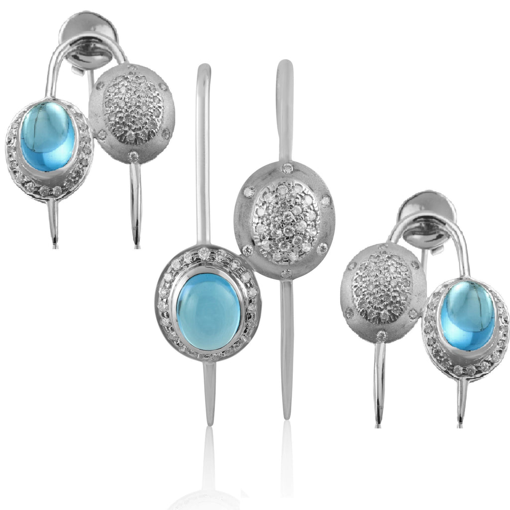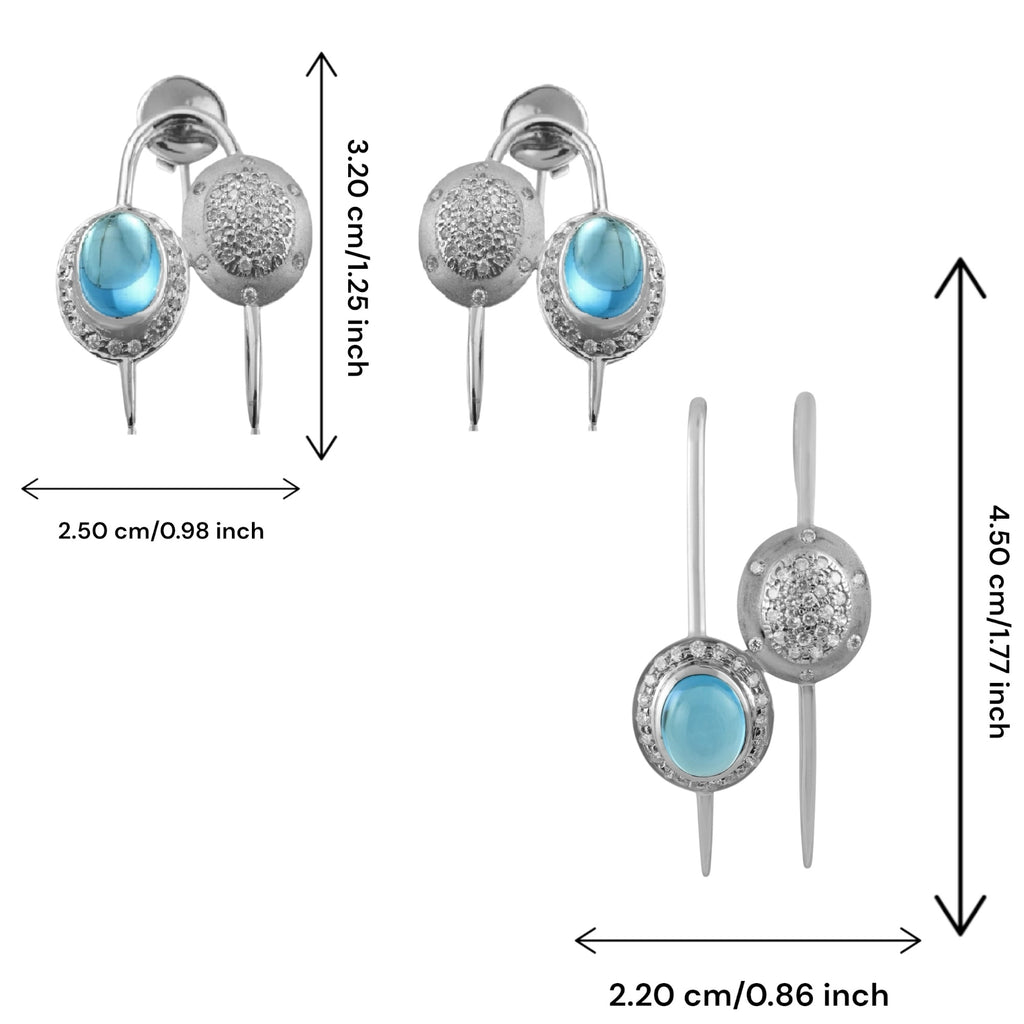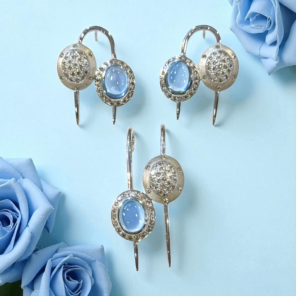 18K White Gold Earring Pendant with Natural Round Diamond & Blue Topaz Cabochon Spearhead Needle Drop Jewellery Set.