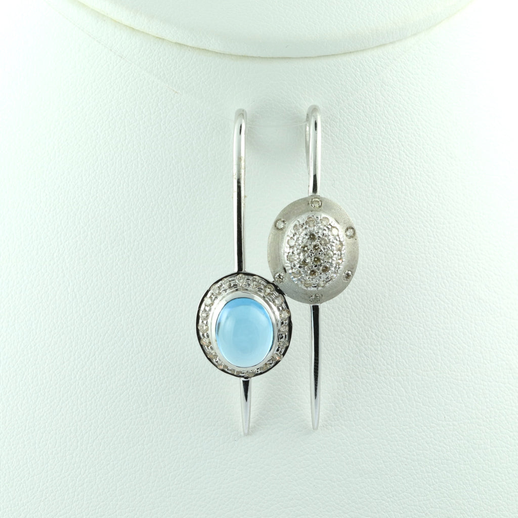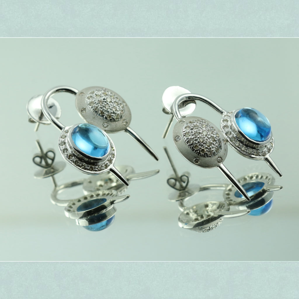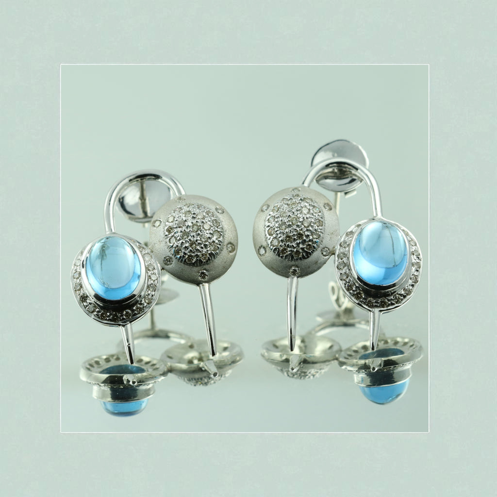 18K White Gold Earring Pendant with Natural Round Diamond & Blue Topaz Cabochon Spearhead Needle Drop Jewellery Set.