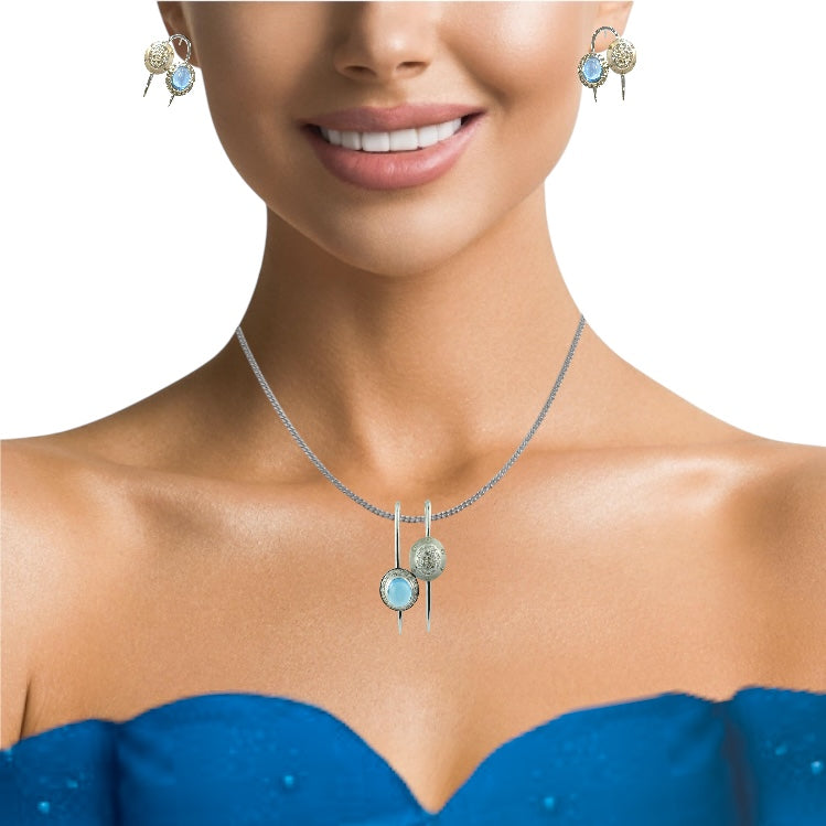Celebrate 18K White Gold Pendant and Earring Set features a Spearhead pointed design, crafted with elegance and modern refinement. Adorned with natural round Diamonds and the serene beauty of Blue Topaz gemstones, this set embodies both sophistication and tranquility.