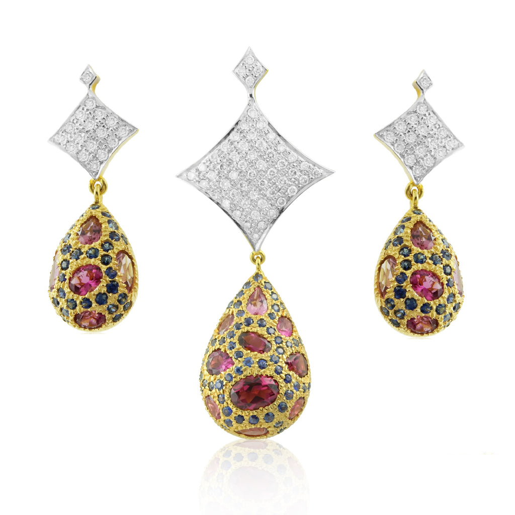 18K White Yellow Dual Gold Pendant Earring with Natural Round Diamond Pink Tourmaline Sapphire Drop Embedded Gemstone Jewellery Set