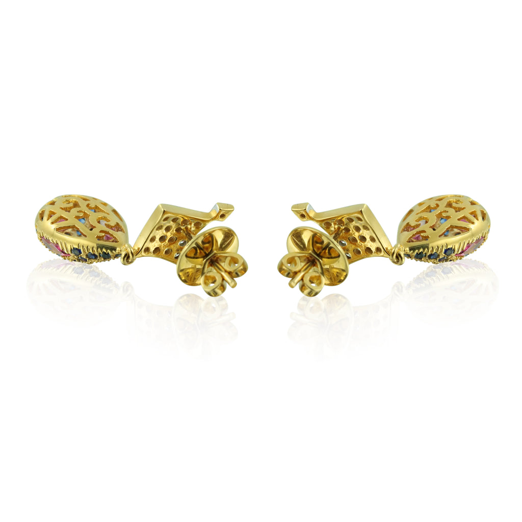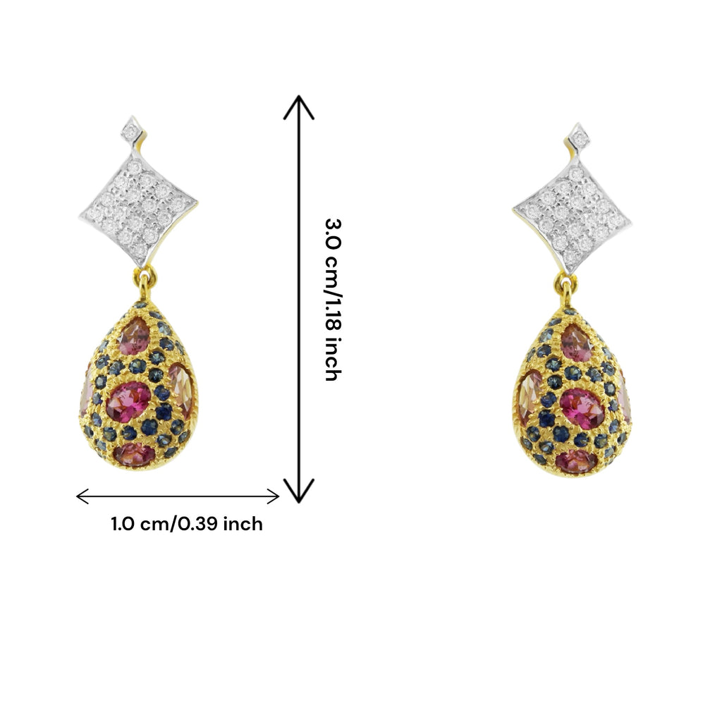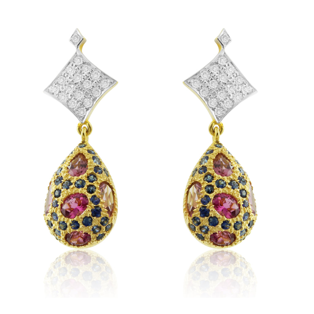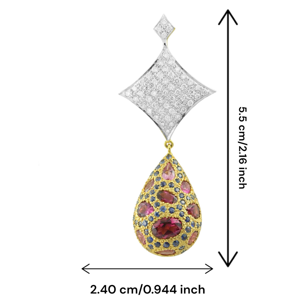The design begins with a sharp, geometric stud of white gold, impeccably paved with glittering diamonds for a contemporary edge. From this, a voluminous teardrop of rich yellow gold is suspended, creating a stunning contrast. This opulent drop is lavishly encrusted with a treasure-like cluster of custom-cut Pink Tourmaline and royal blue Sapphires, evoking a sense of timeless, regal luxury. The coordinating pendant mirrors this exquisite design, ensuring a look of complete harmony for your wedding day and special occasions.