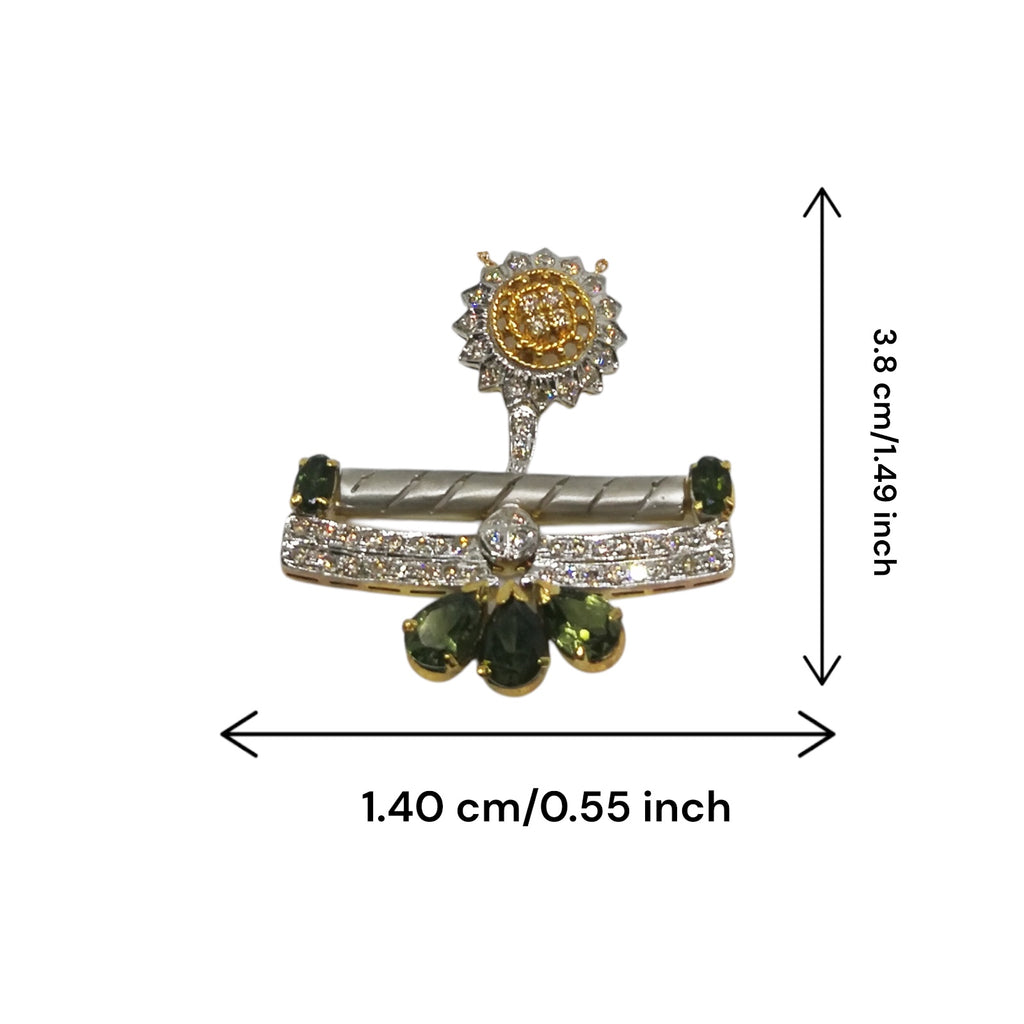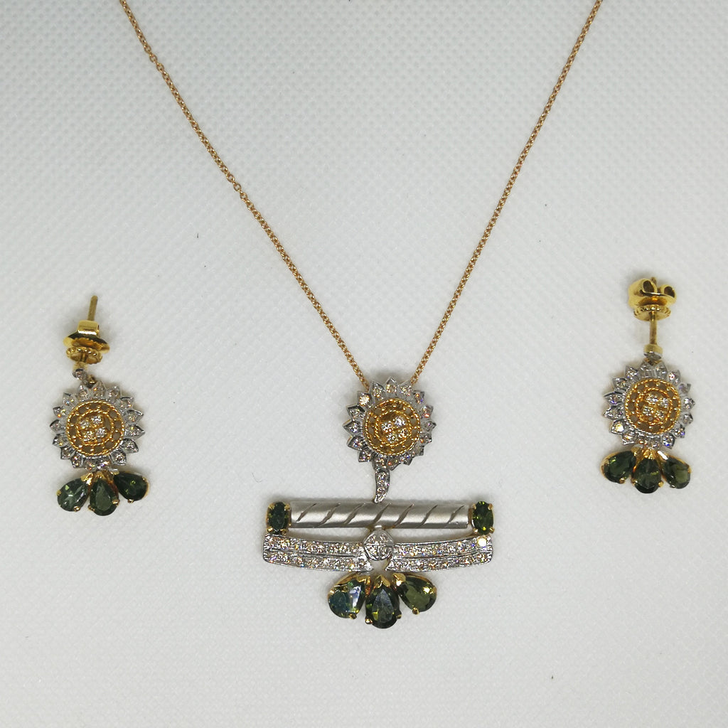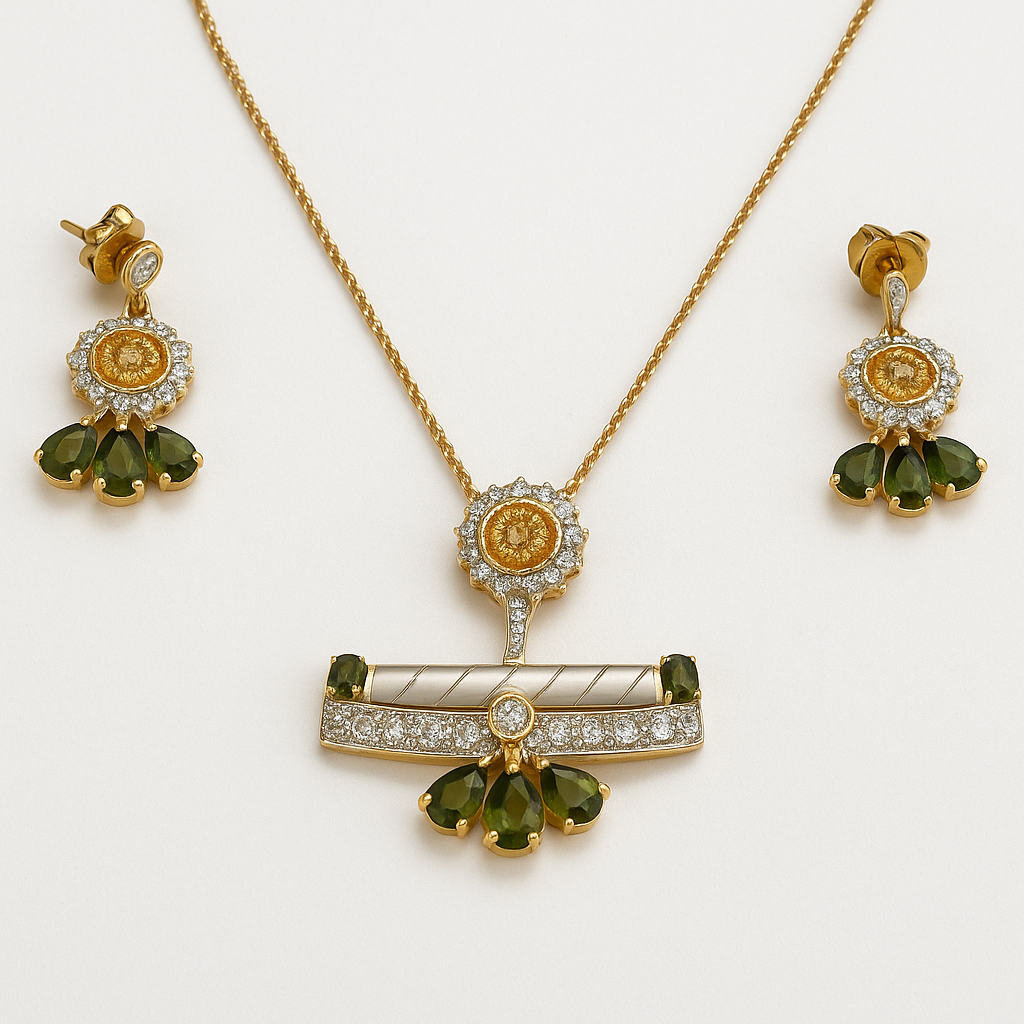 18K Yellow Gold Pendant Earring with Natural Round Diamond & Green Tourmaline Forest Floral Jewellery Set