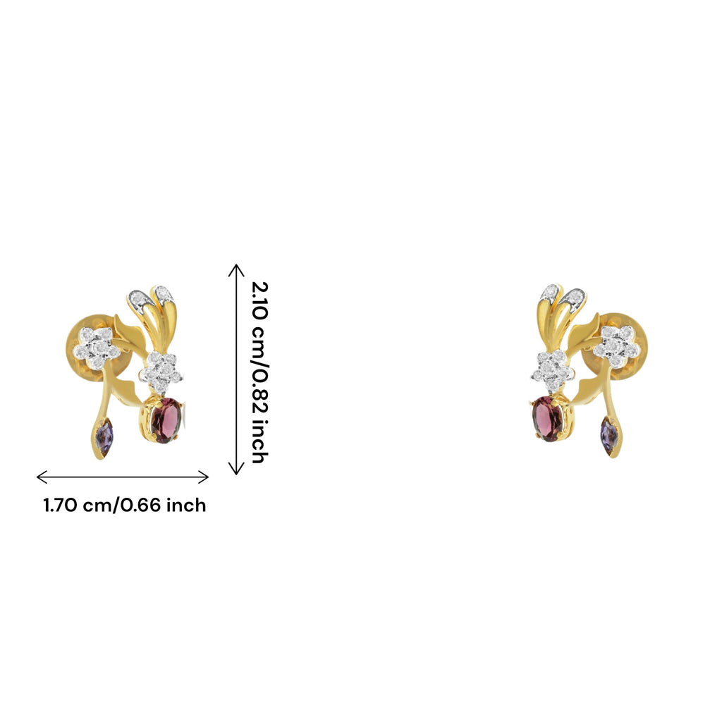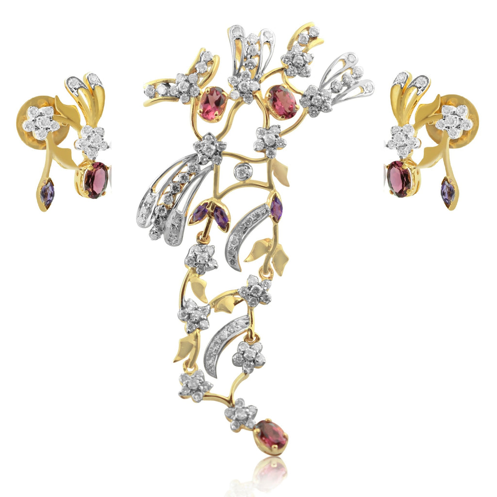 18K Yellow Gold Pendant Earring with Natural Round Diamond, Rhodolite & Amethyst Floral Branch Design Jewellery Set
