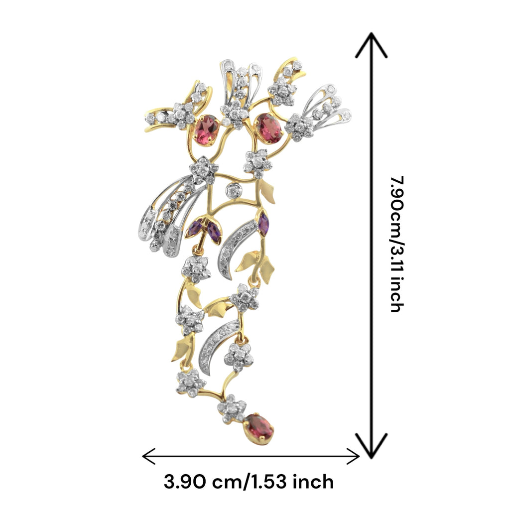 The pendant cascades gracefully, creating a unique asymmetrical silhouette where lush Pink Tourmaline and rich Amethyst are set like delicate blossoms among the diamond-paved branches. The coordinating earrings perfectly mirror this floral motif, framing the face with elegance and charm, making them the perfect accessory for a bride. The masterful yellow gold design adds depth and sophistication to this wearable work of art.
