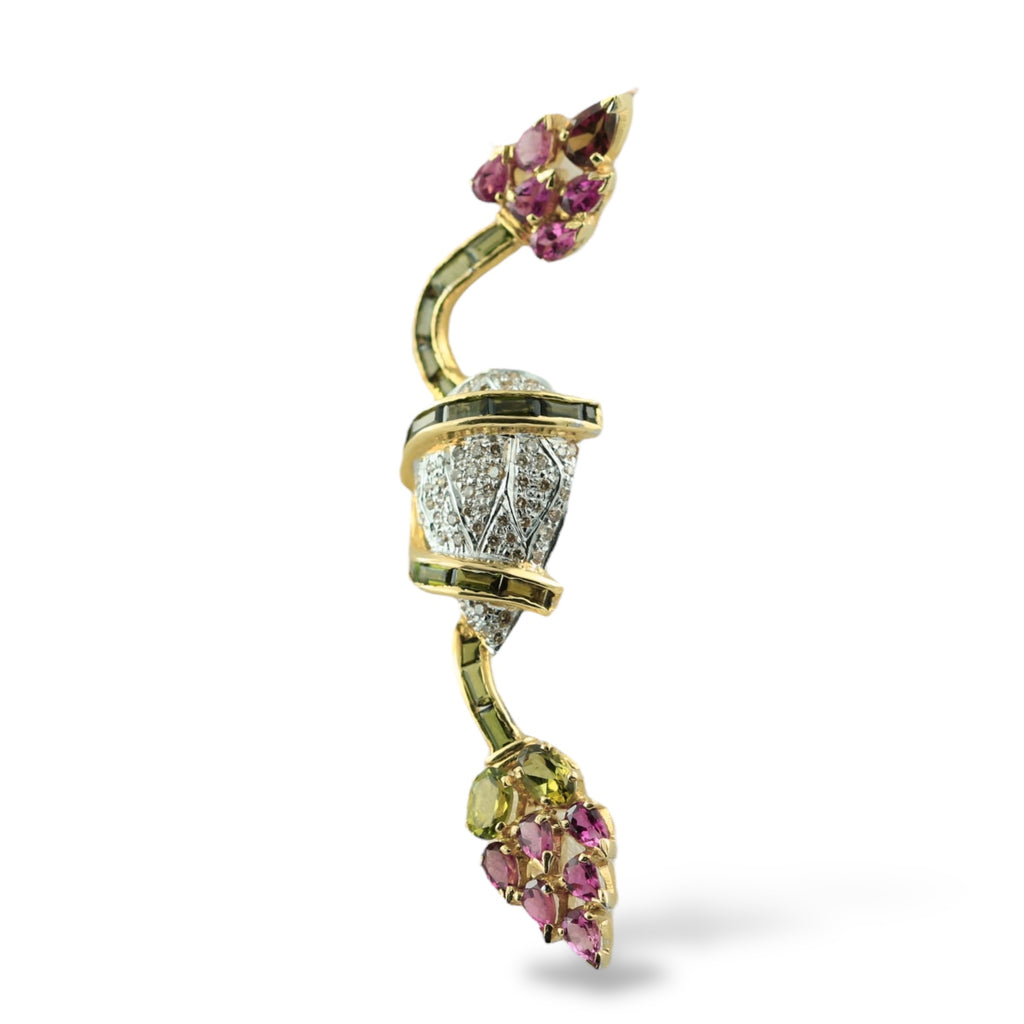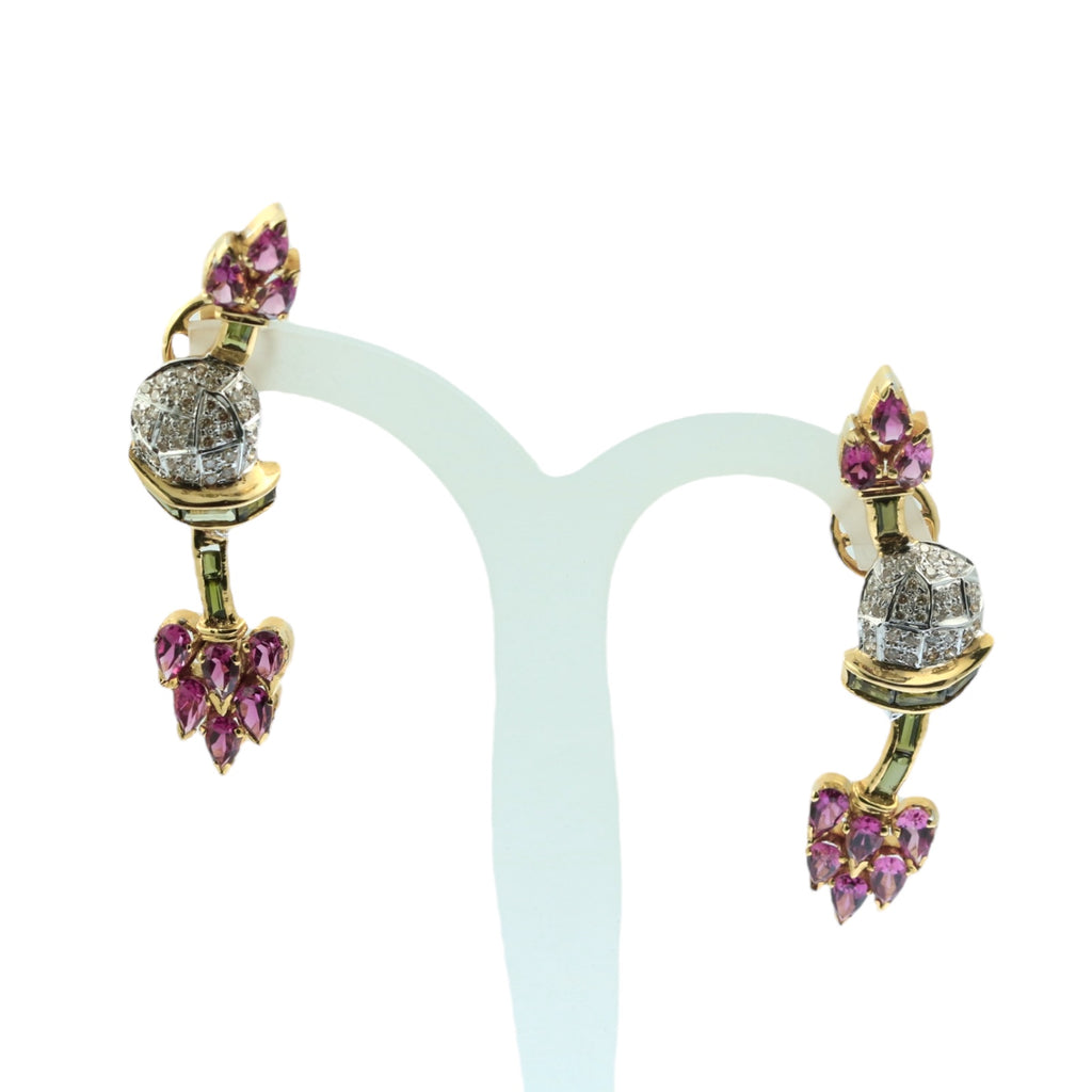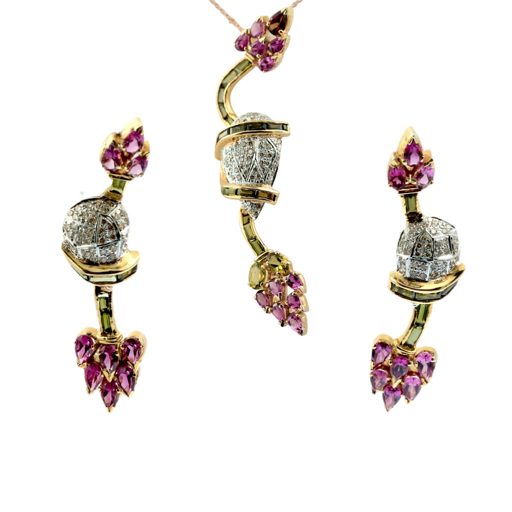 18K Yellow Gold Natural Round Diamond & Multi Tourmaline Royal Lotus Design Pendant Earring Jewellery Set