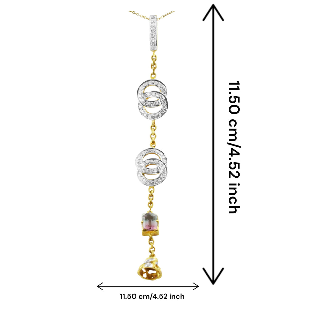 The dramatic Gucci-style pendant cascades beautifully, featuring a chain of diamond-encrusted interlocking circles that create a sense of fluid luxury. The star of the pendant is a magnificent, custom-cut Tourmaline, showcasing its magical transition from sunny yellow to royal purple within a single gem. The drop earrings perfectly mirror the pendant's signature motifs, creating a cohesive look of designer-inspired luxury that is both sophisticated and eye-catching for your wedding day, festive events and special occasions.