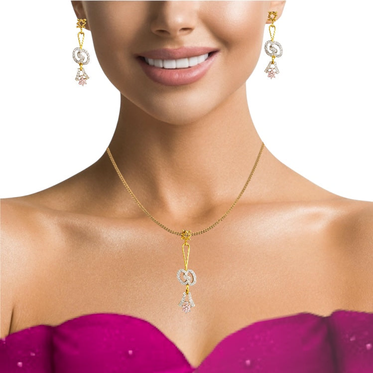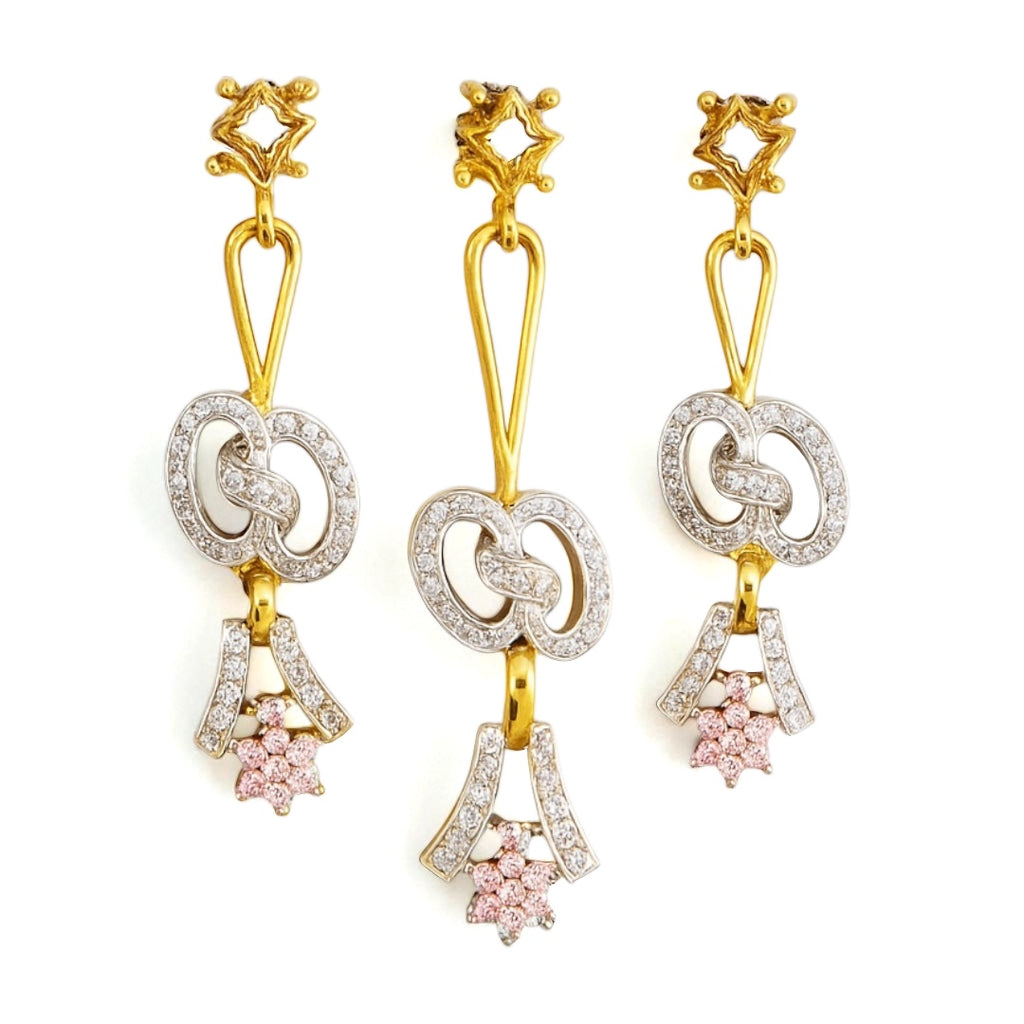 Celebrate your journey to forever with this gracefully modern Pendant and Earring Set, a sophisticated choice from our exclusive Bridal Collection. Expertly crafted in 18K Yellow Gold, this set features a fluid, open-loop design that sparkles with an impressive array of Natural Diamonds and the soft blush of natural Pink Sapphire. It's a design that embodies elegance, movement, and contemporary romance.