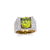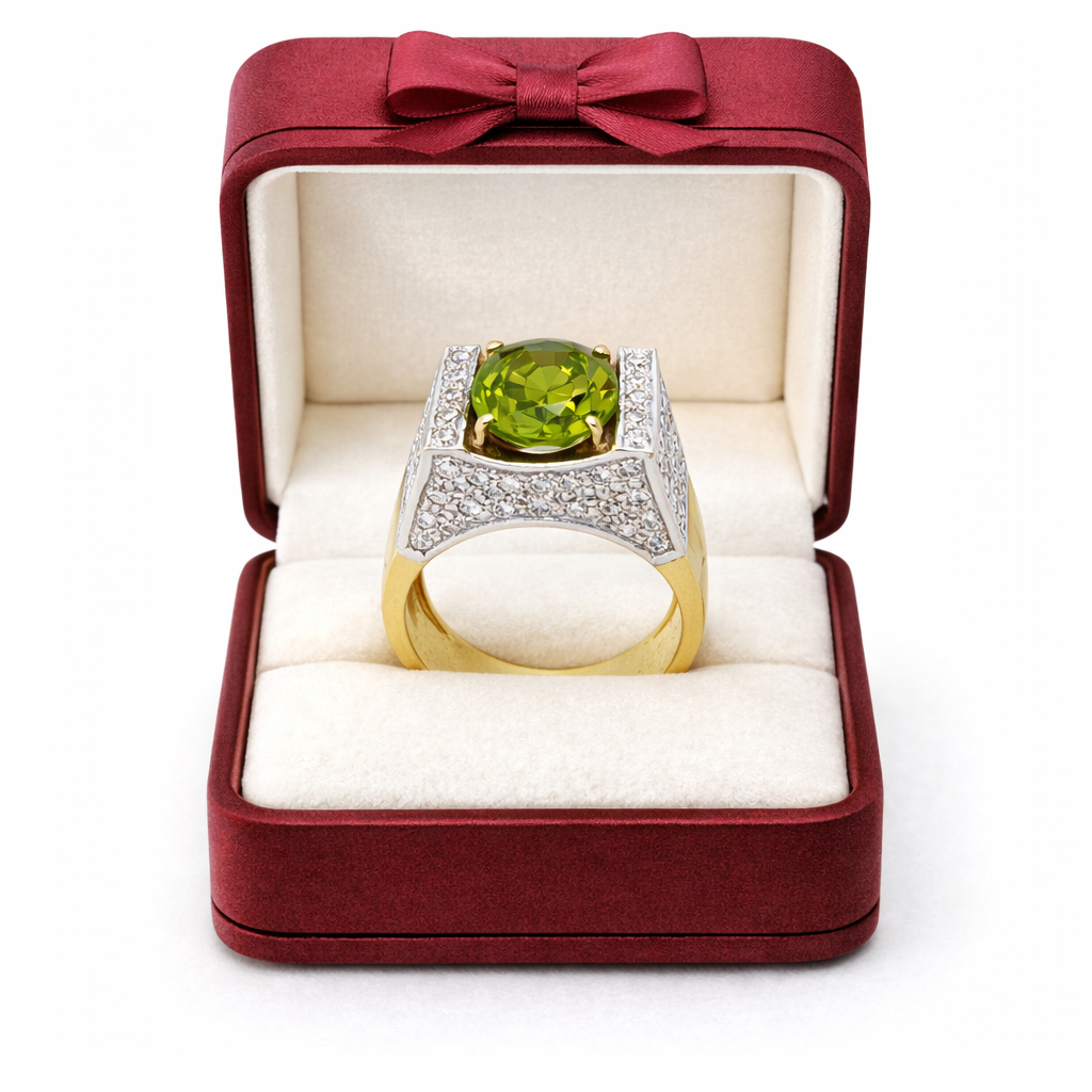 The bold geometric design reflects classic Art Deco architecture, while the dual-tone gold setting enhances depth and contrast. Diamond-accented panels frame the peridot beautifully, creating a refined yet powerful dinner or cocktail ring silhouette.