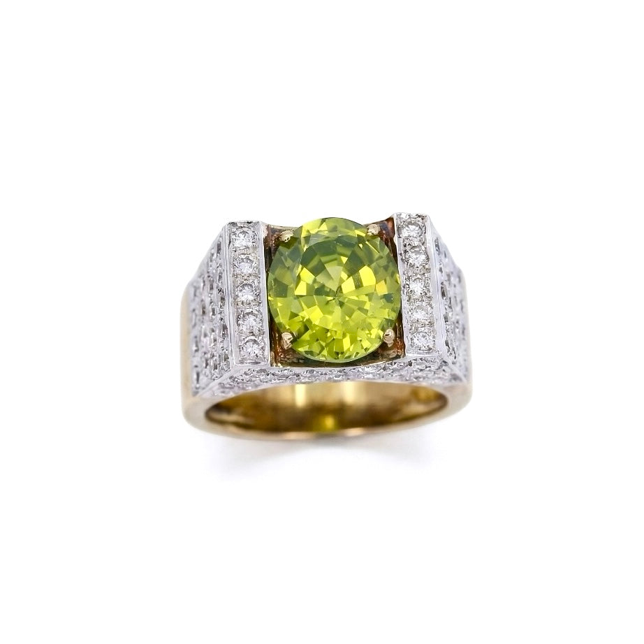 Celebrate timeless glamour with this striking 18K white & yellow gold art deco statement ring, featuring a vibrant natural oval Peridot center stone accented by shimmering natural Diamonds.