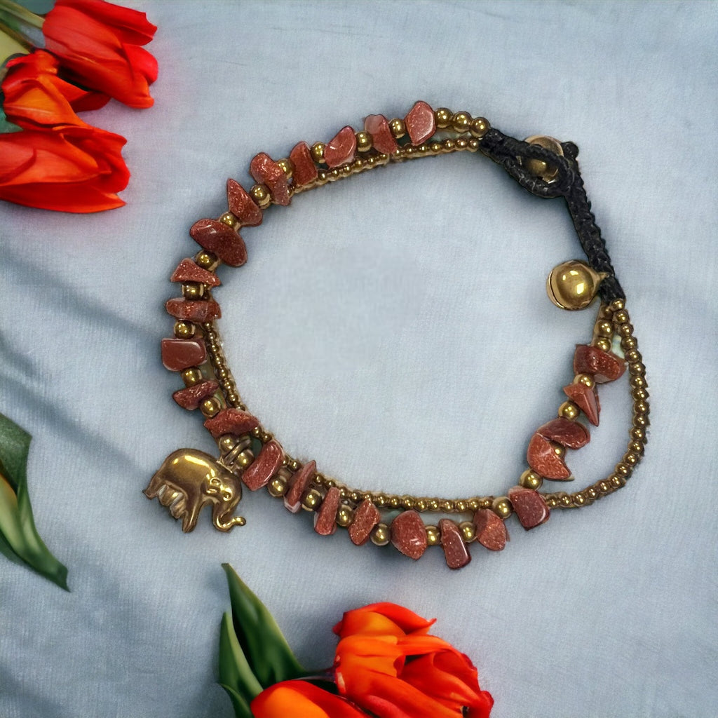 This piece of jewelry is a handmade bracelet or anklet with natural gemstones. The gemstones are alternated with petite brass beads, accompanied by a beaded strand of brass tied in a wax polyester cord. This handmade design orchestrates a dazzling harmony of colors. This can worn as a bracelet or anklet has a loop and hollow brass bell closure. This design features bells that produce sound and is completely adjustable.