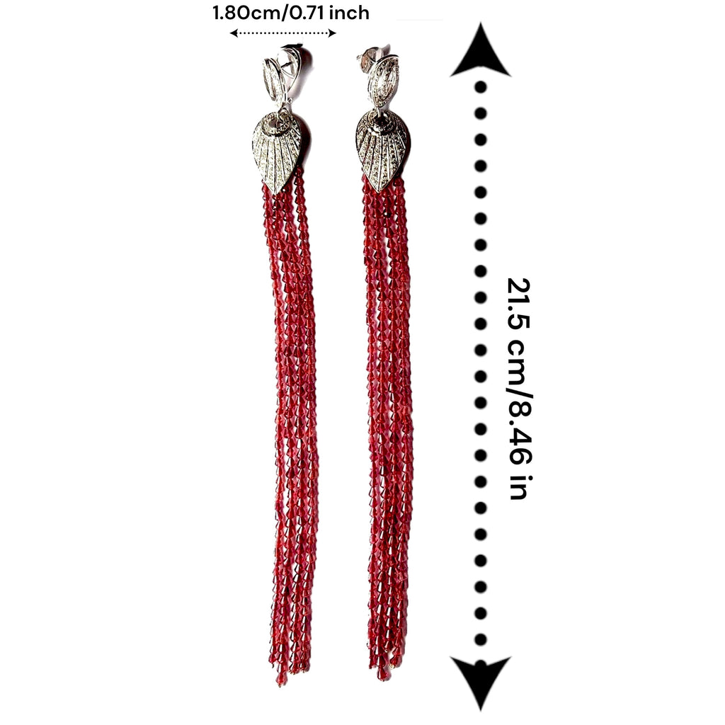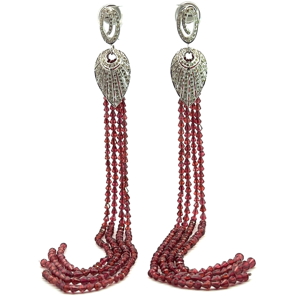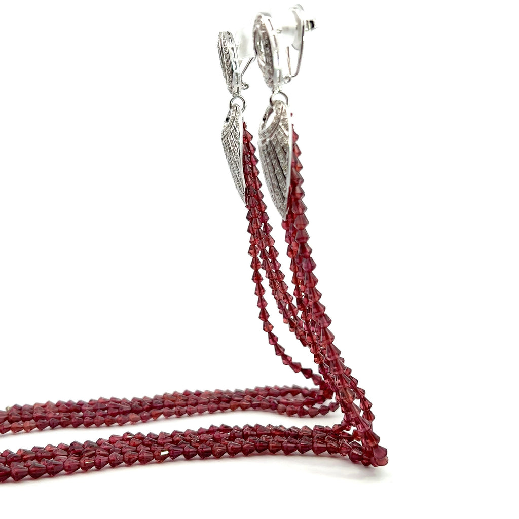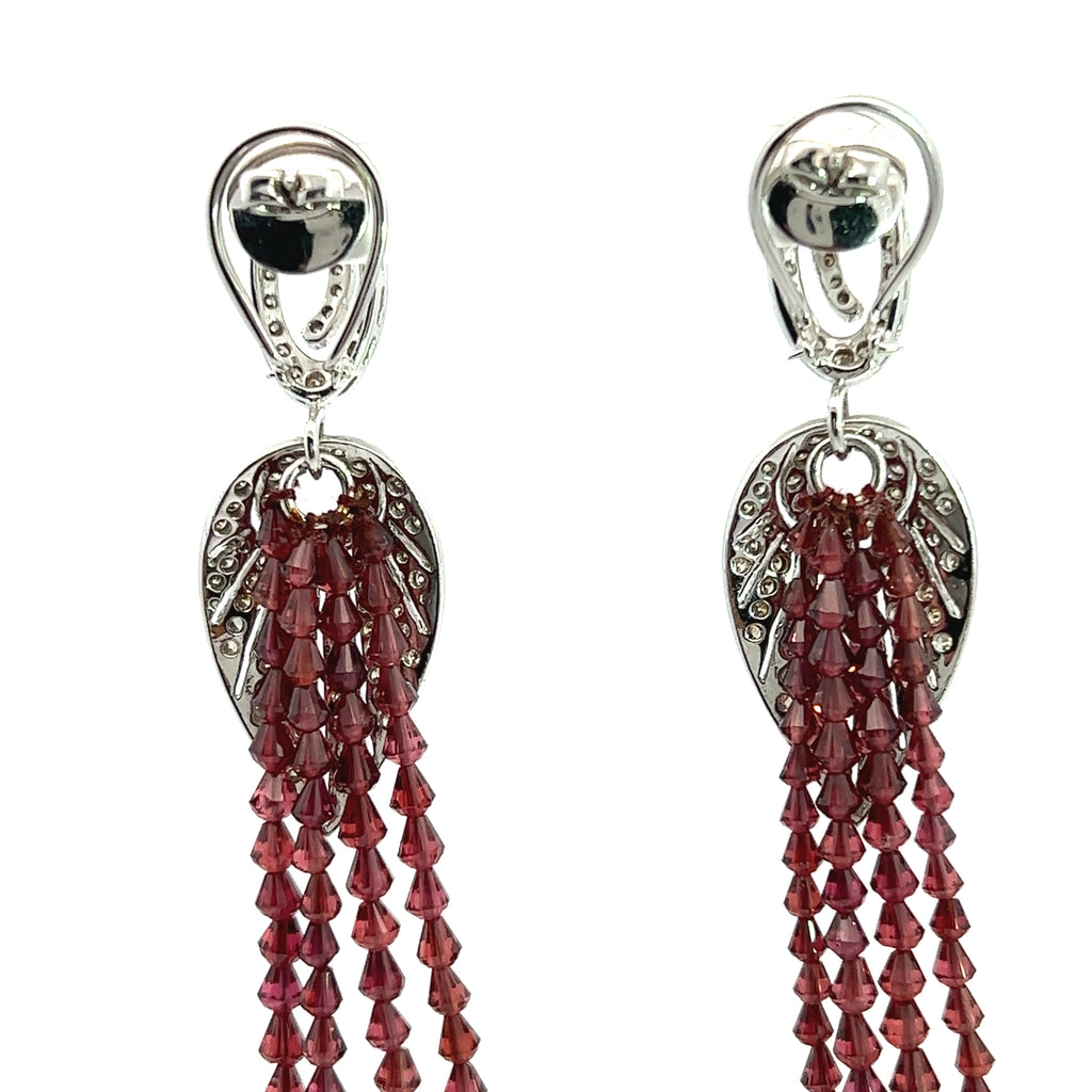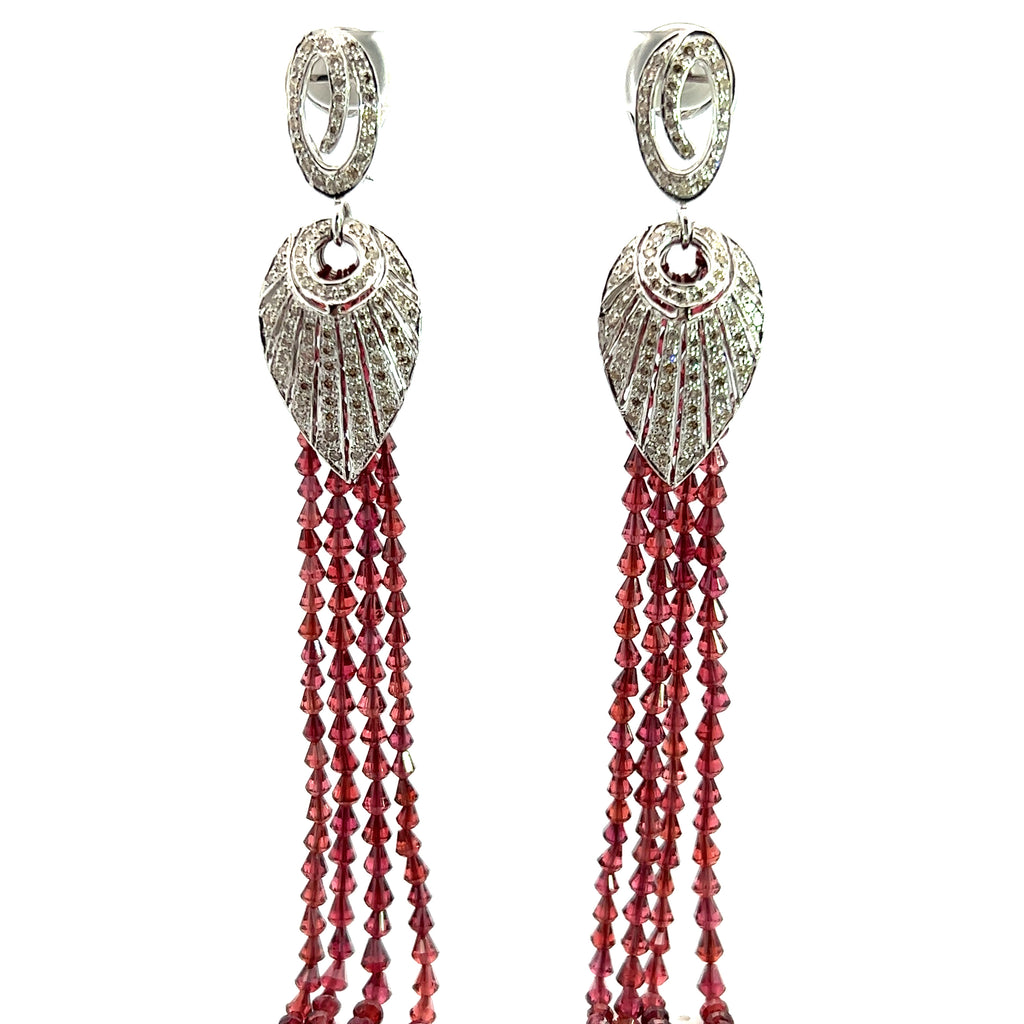 Celebrate striking elegance with these 18K White Gold Shoulder Duster Earrings, featuring a captivating combination of natural diamonds and vibrant rhodolite gemstones. The elongated design creates a bold yet graceful statement, perfectly balancing sparkle and rich color.
