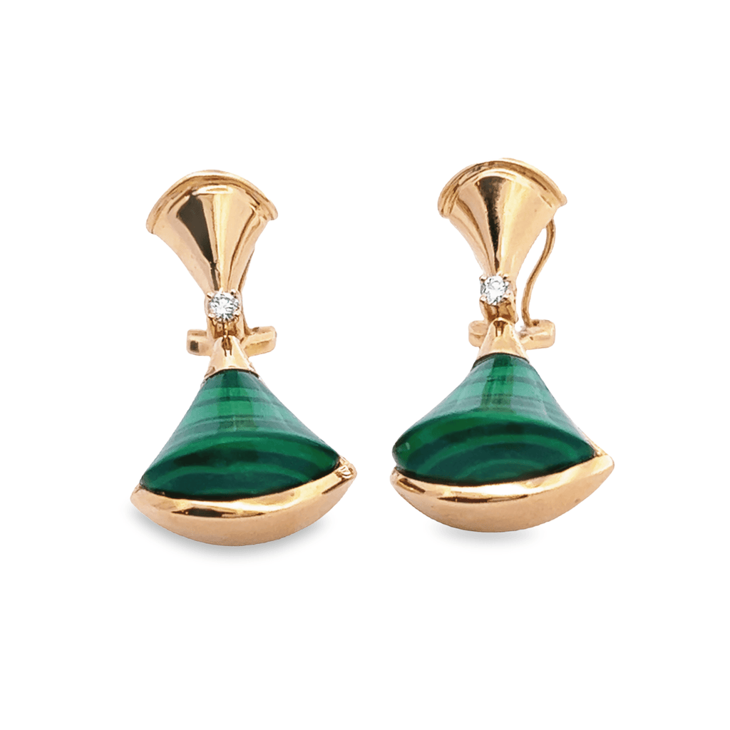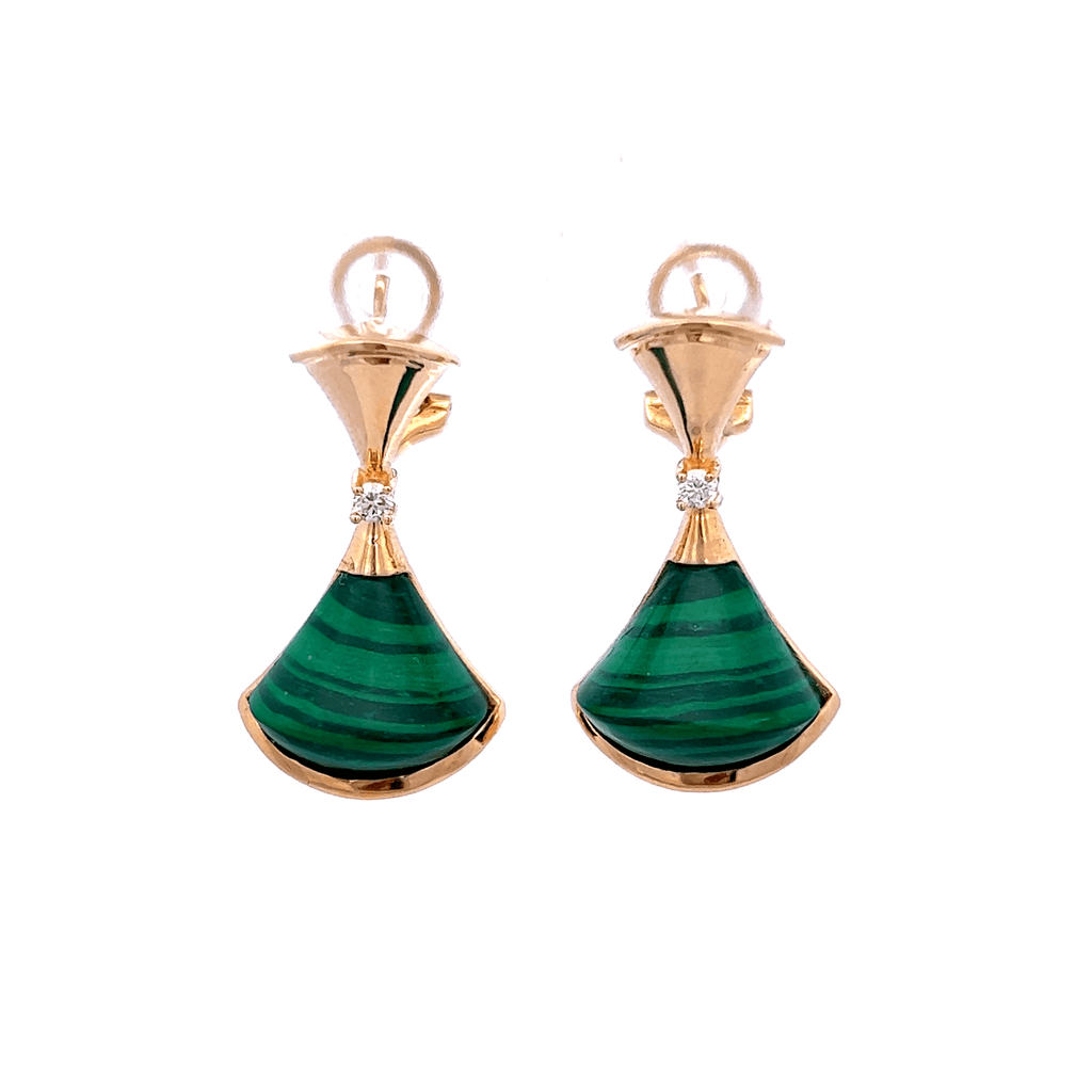 Add a luxurious touch to your look with these 18K rose gold with diamond and green malachite fancy big fan earrings. Expertly crafted with natural round diamonds and green malachite stones, they are sure to add a unique elegance to your wardrobe.