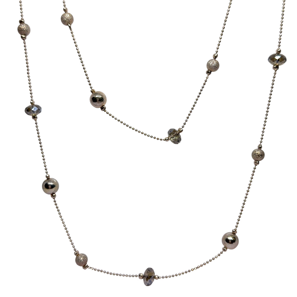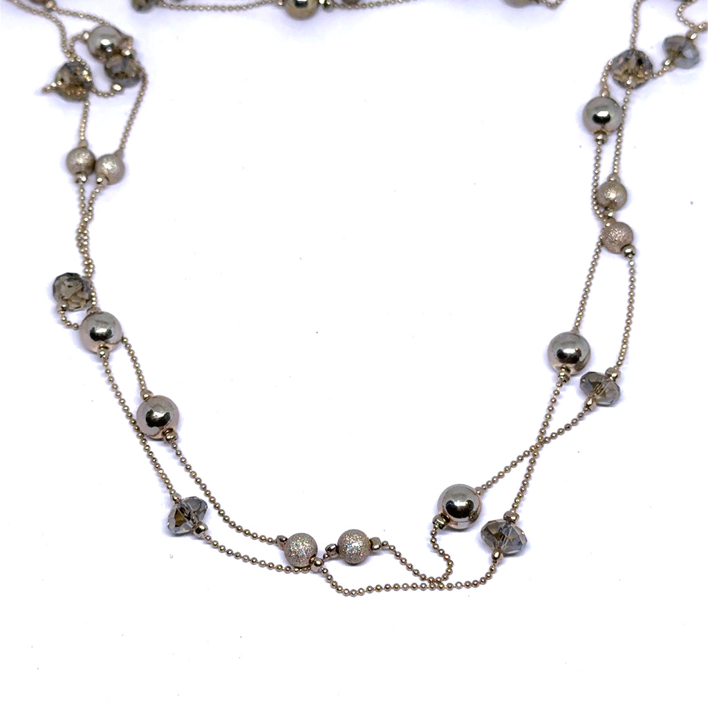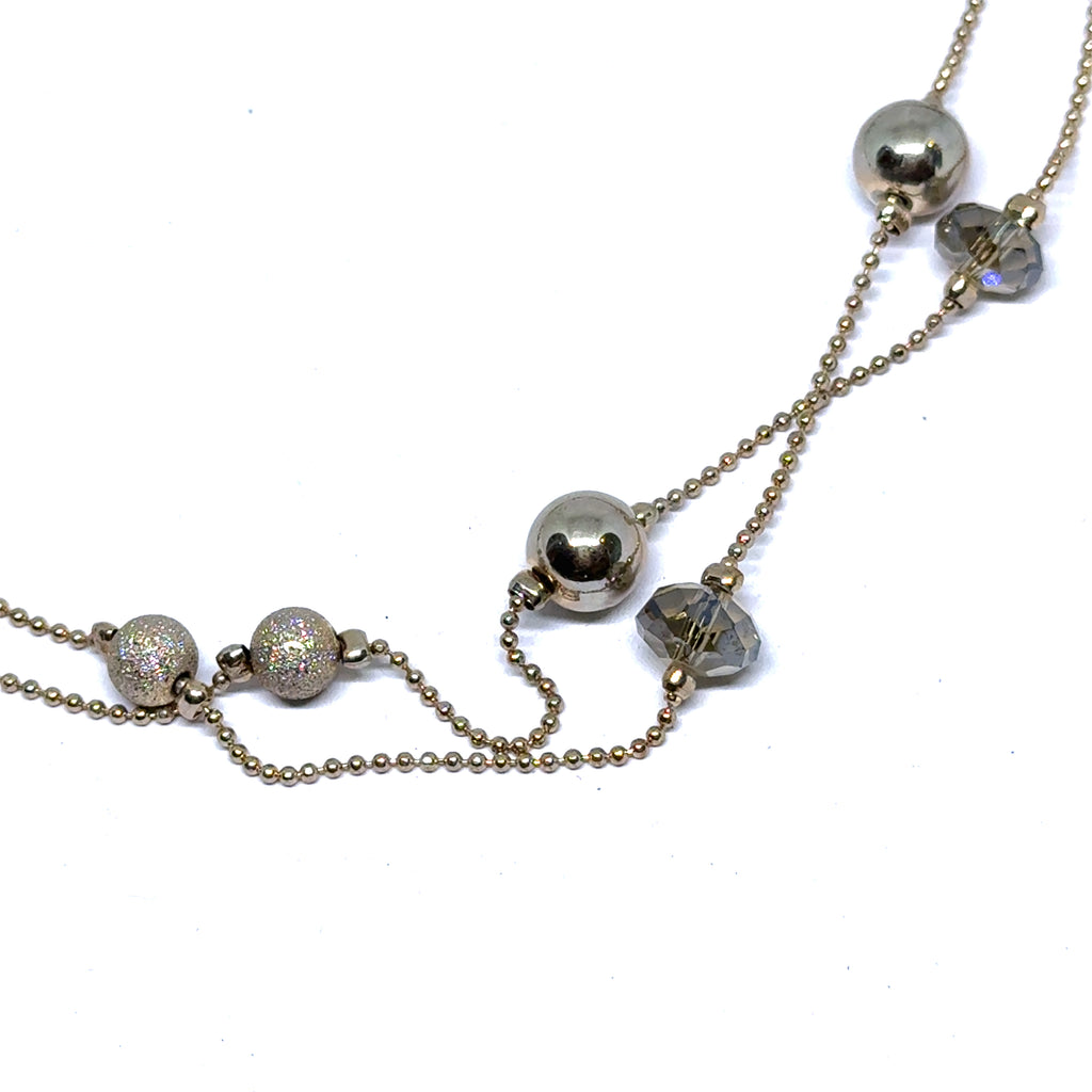 Make a dazzling entrance with this layered necklace featuring a playful mix of glittering beaded balls and faceted crystal-like stones. The delicate dual-strand design adds movement and sparkle, perfect for lighting up your look at parties, evening events, or Mardi Gras celebrations.