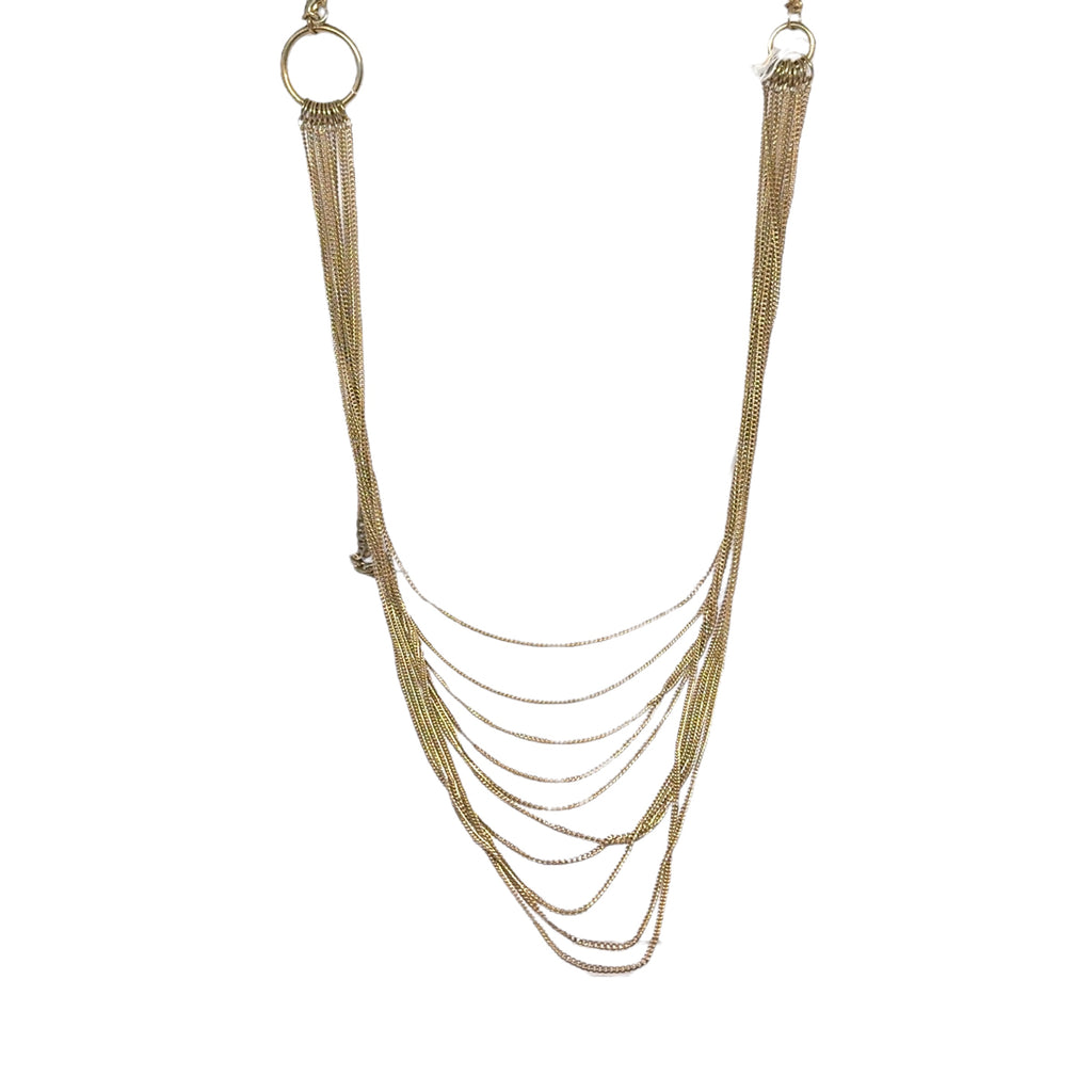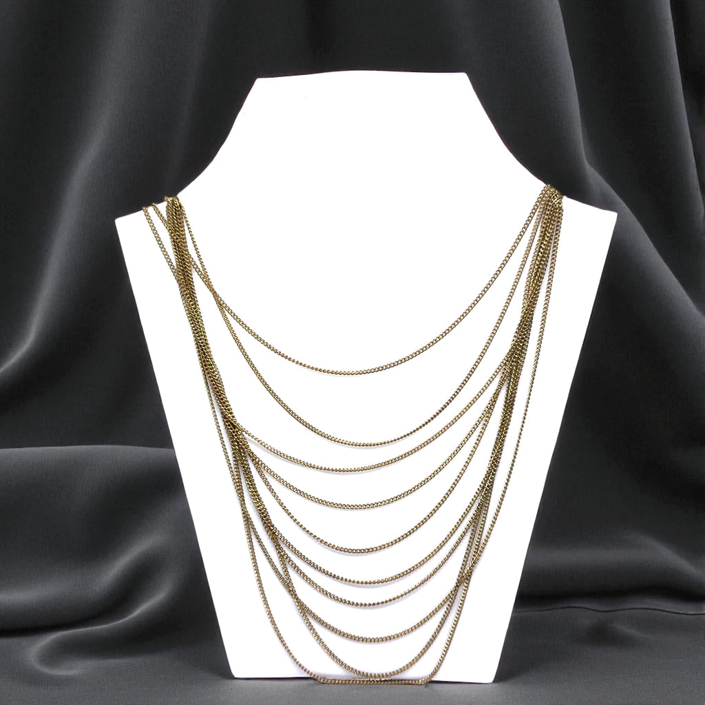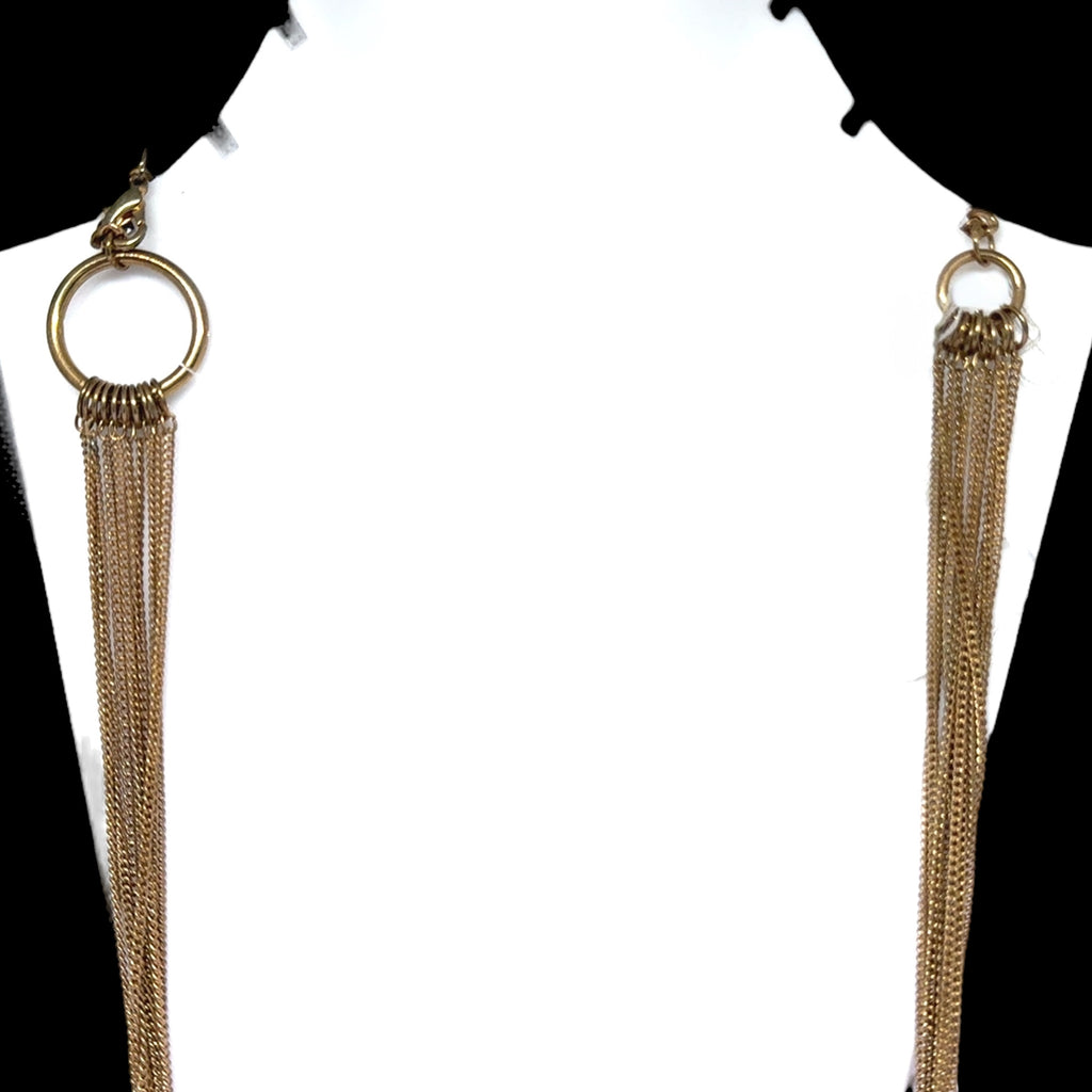 Crafted with lightweight, high-polish chains that drape gracefully, this fashion-forward necklace offers a modern twist on classic layering. The statement hoops anchor the cascading strands, creating a balanced silhouette that complements both high necklines and deep v-necks alike.