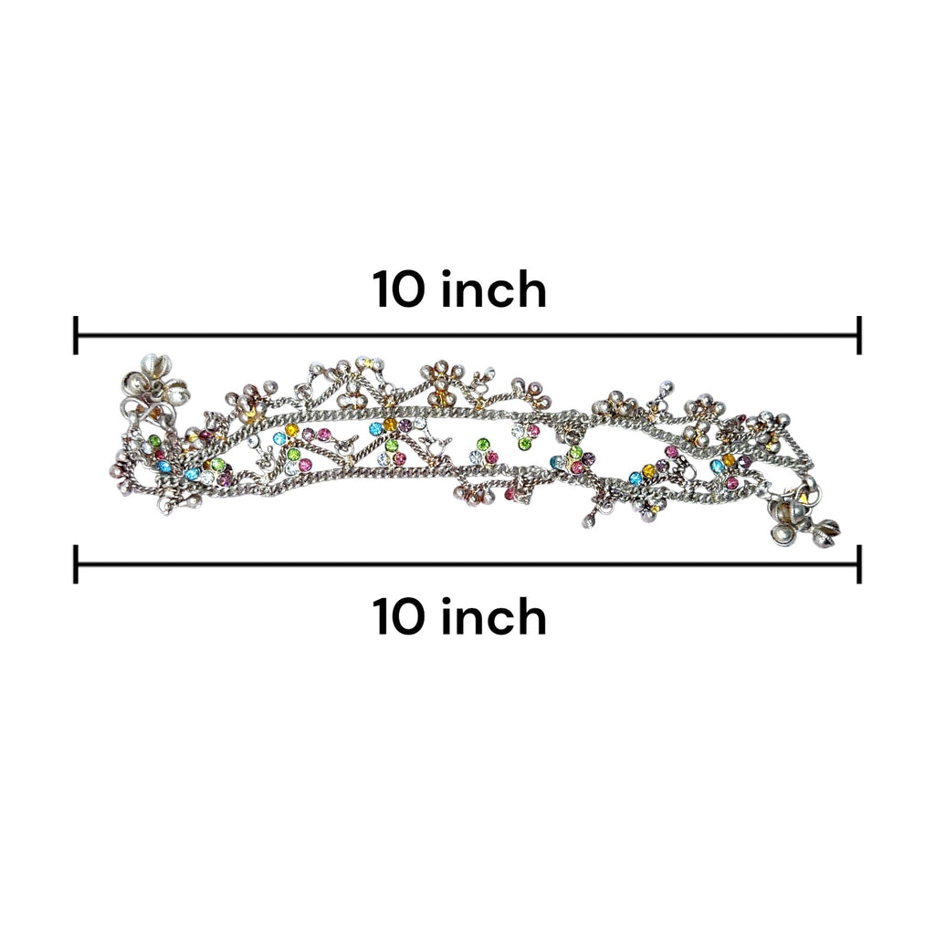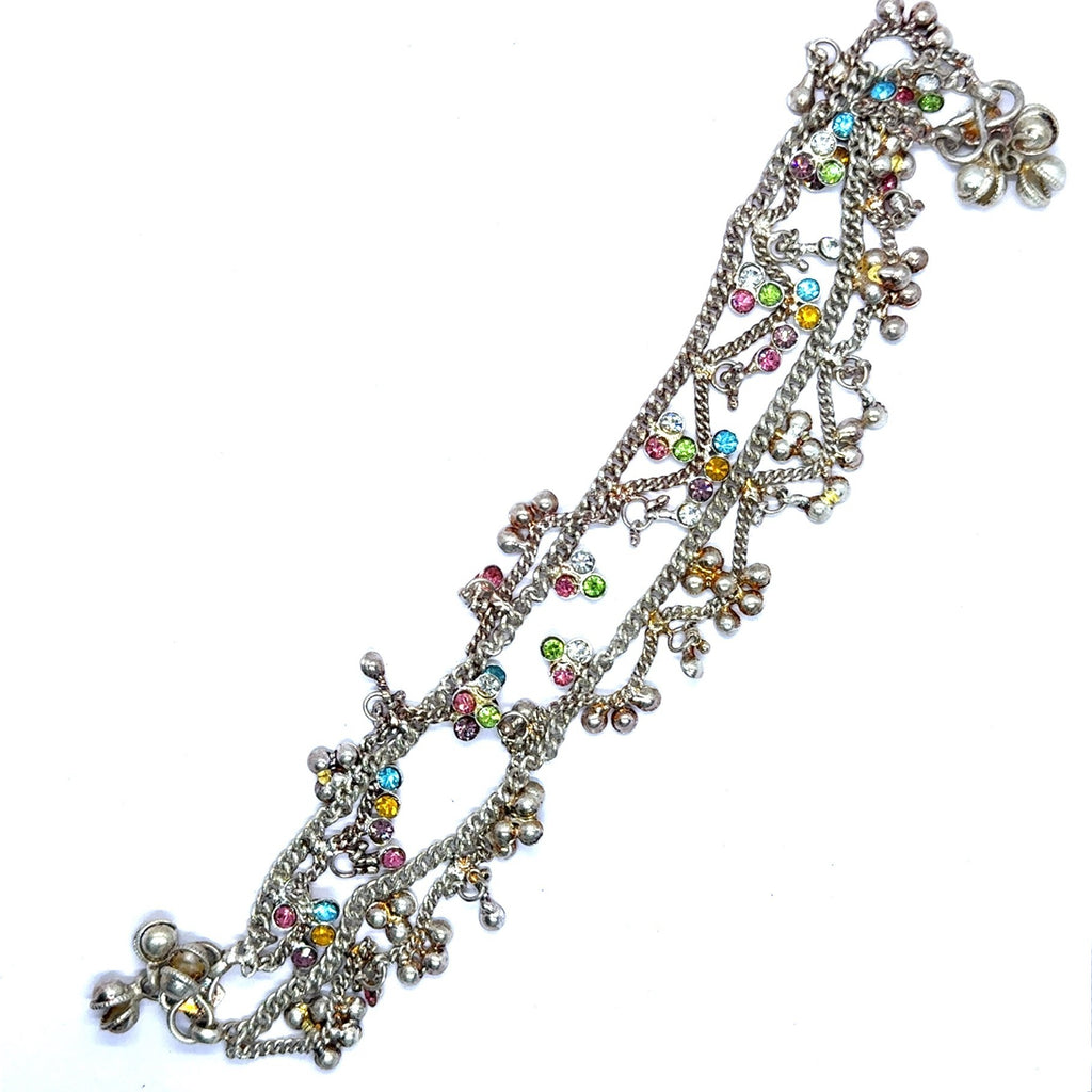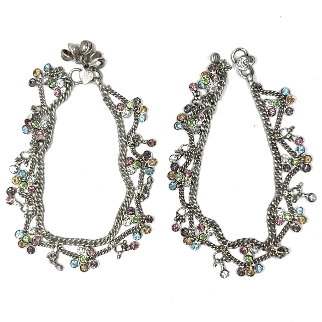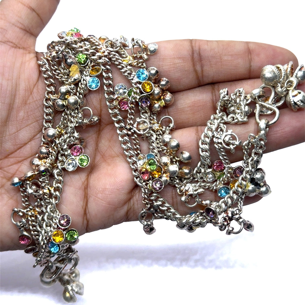 Celebrate a symphony of color and sound with this stunning pair of German silver anklets. These exceptionally vibrant anklets feature a dense, multi-layered design, lavishly adorned with a dazzling array of colorful stones and a cascade of sound charms. The oxidized silver finish provides a beautiful backdrop that makes the colors pop. Designed to create a lively, musical jingle with every movement, this pair is a joyful and exuberant accessory perfect for weddings, festivals, and dance. A truly stunning piece, it embodies a spirit of vibrant celebration.