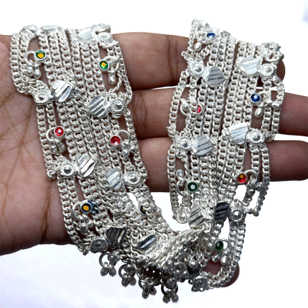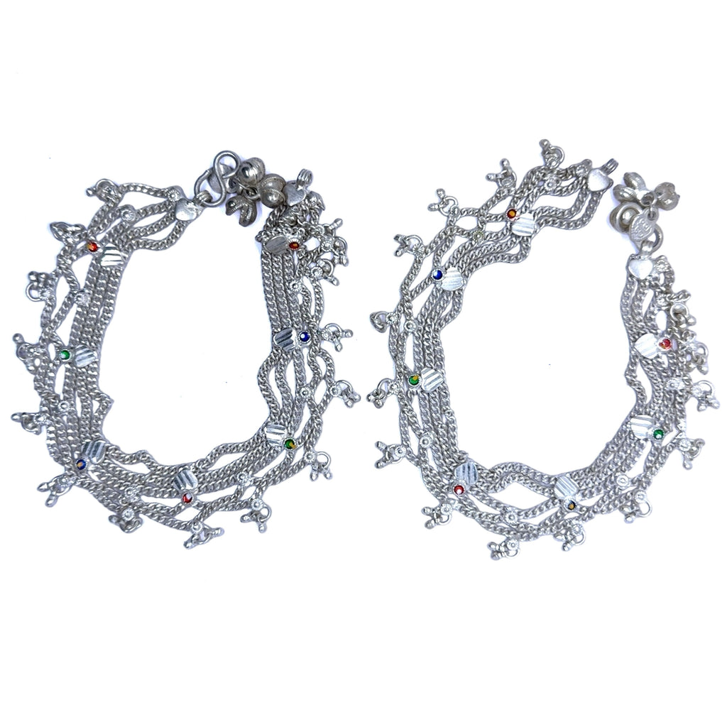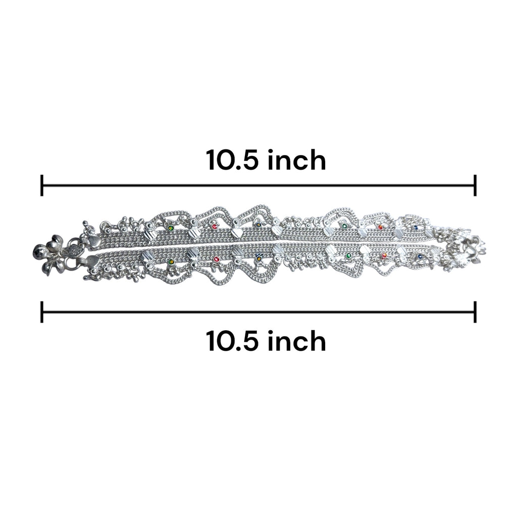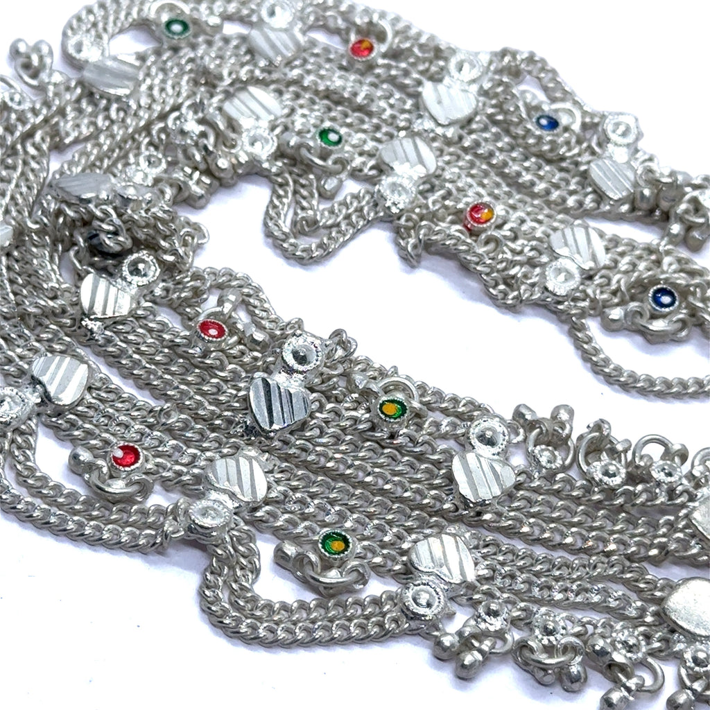 Celebrate festive grandeur with this magnificent pair of German silver payal. These exceptionally ornate anklets feature a wide, multi-layered band detailed with subtly engraved heart motifs and a profusion of dangling bell charms. A sprinkling of colorful beads adds a vibrant touch to the bright, oxidized silver finish, creating a stunning visual effect. Designed to produce a rich, musical chime with every step, this payal set is a show-stopping accessory for weddings and cultural celebrations, embodying the spirit of opulent tradition.