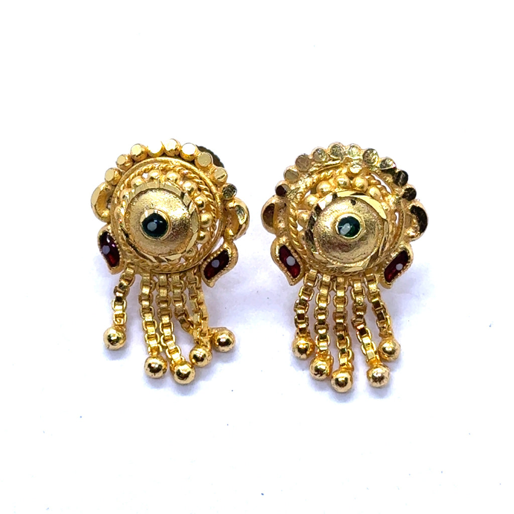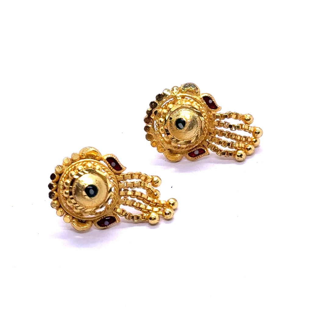 These elegant round studs are intricately textured and centered with a subtle gemstone. The red petal-shaped accents around the rim and cascading tassels give it an elevated ethnic charm.