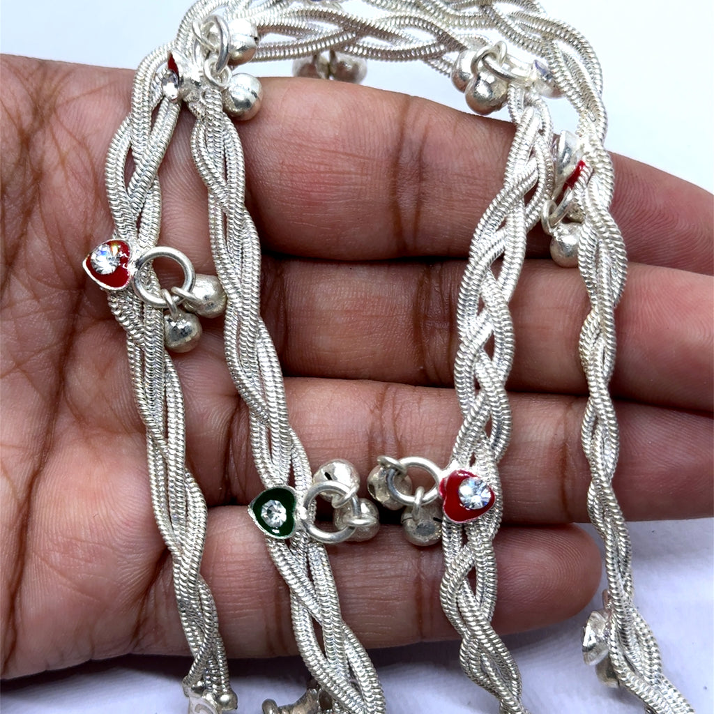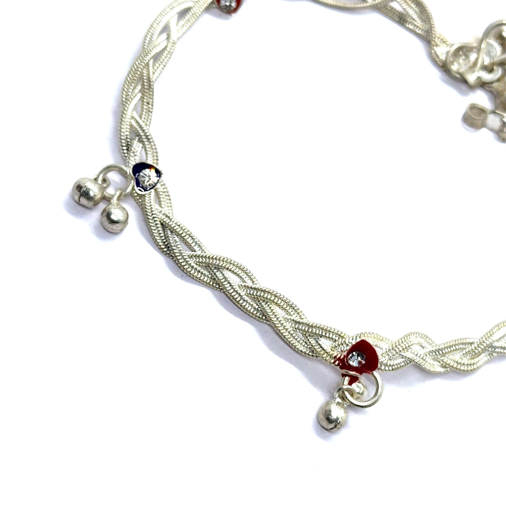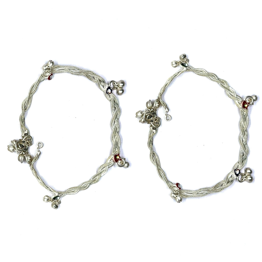 Celebrate playful elegance with this charming pair of German silver anklets. These beautiful anklets feature a stylishly twisted rope chain design, brought to life with delicate dangling charms that add a touch of whimsical movement with every step. A pop of vibrant red beading provides a captivating contrast to the bright, silvery finish of the German silver. Perfect for adding a free-spirited and musical jingle to your look, this pair is a delightful accessory for both casual and festive occasions.