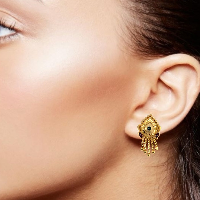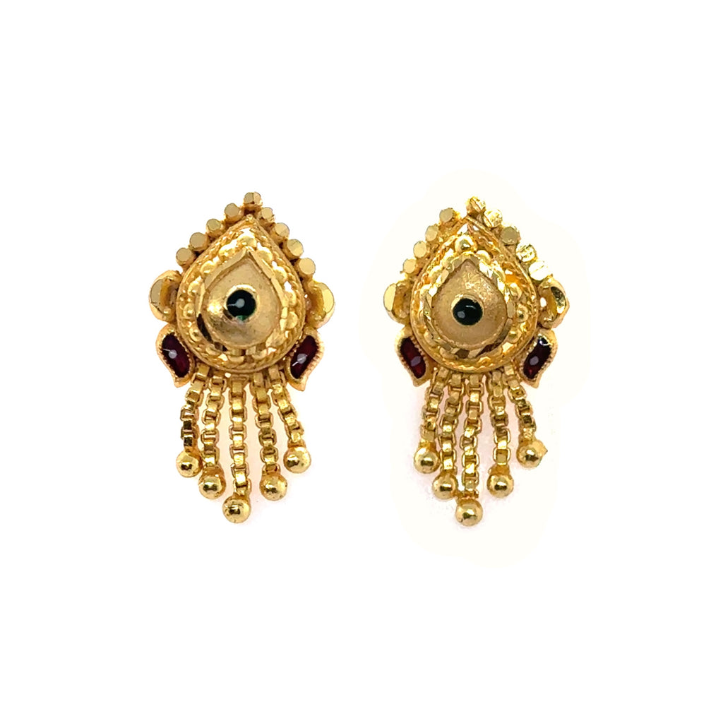 These retro designed earrings boast a teardrop frame with detailed engraving and central green stone. The addition of red enamel leaf accents and traditional ball chain drops create an authentic ethnic finish.