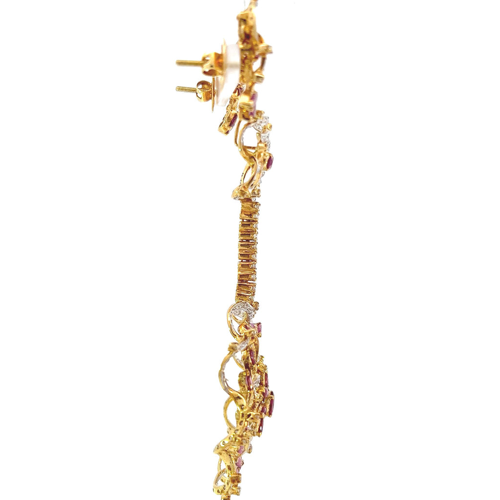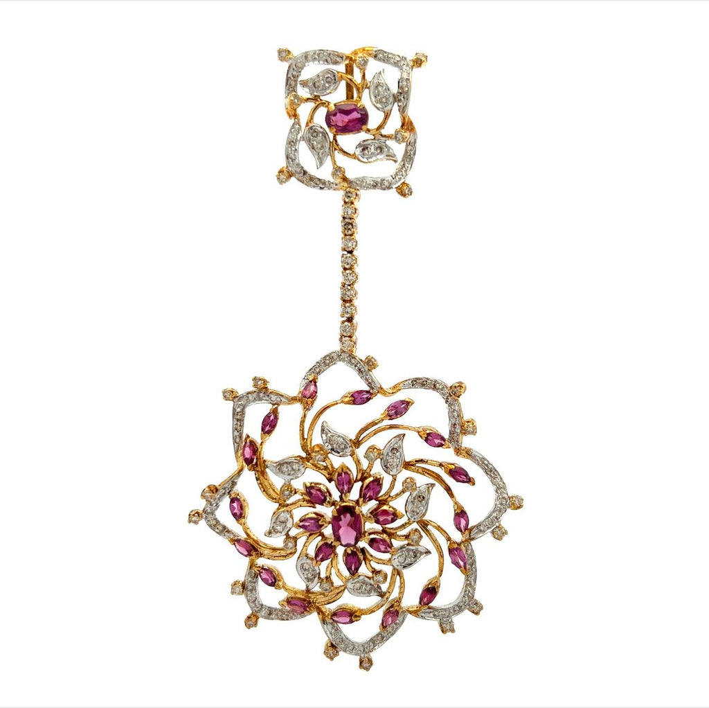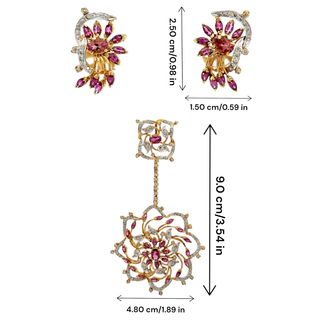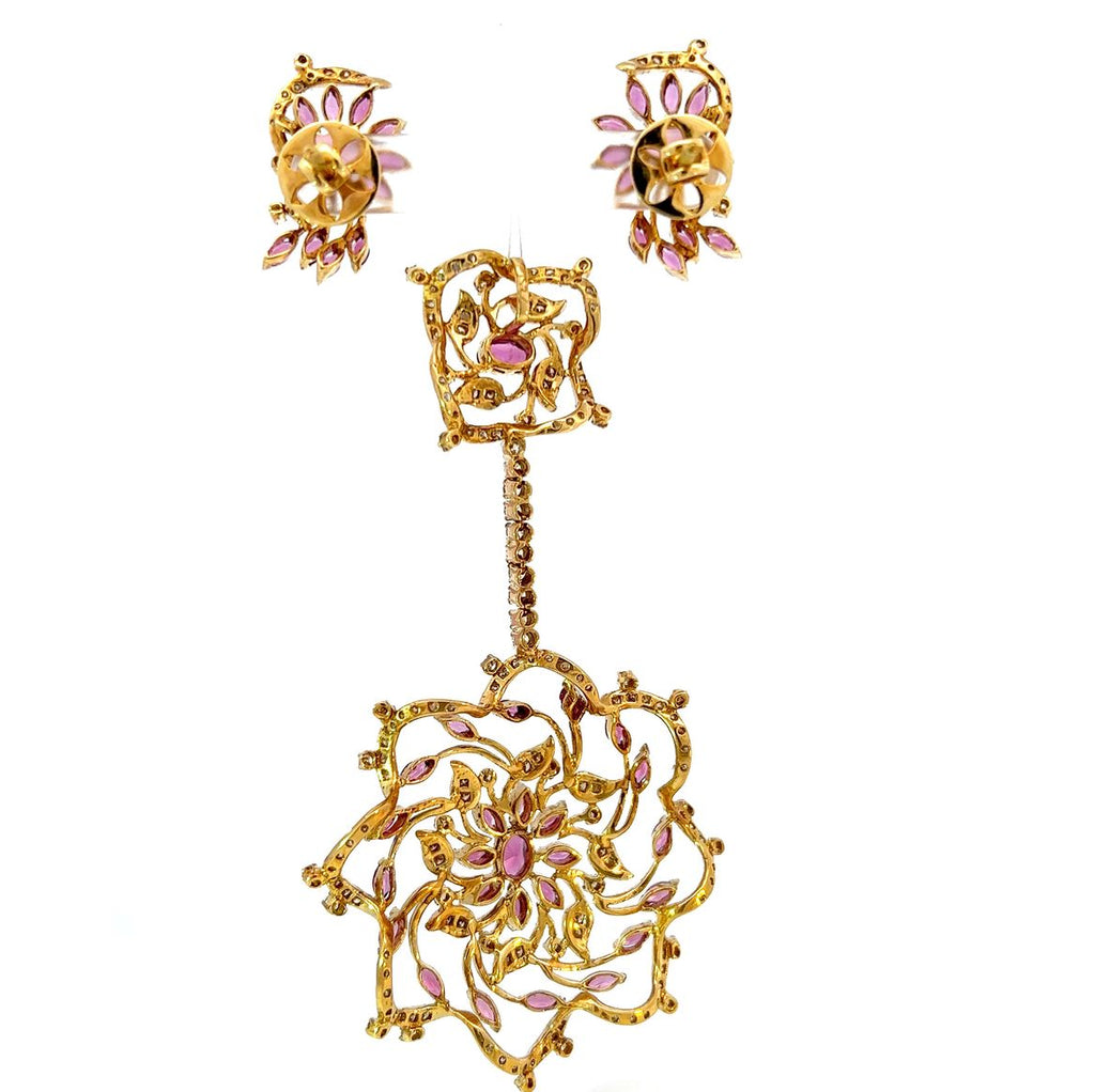 The flower design, representing growth, beauty, and renewal, makes this set truly stand out, while the combination of rich deep pink and yellow gold adds depth and sophistication to the look. This pendant and earring set is both statement-making and timeless, making it an ideal gift or addition to any fine jewelry collection.