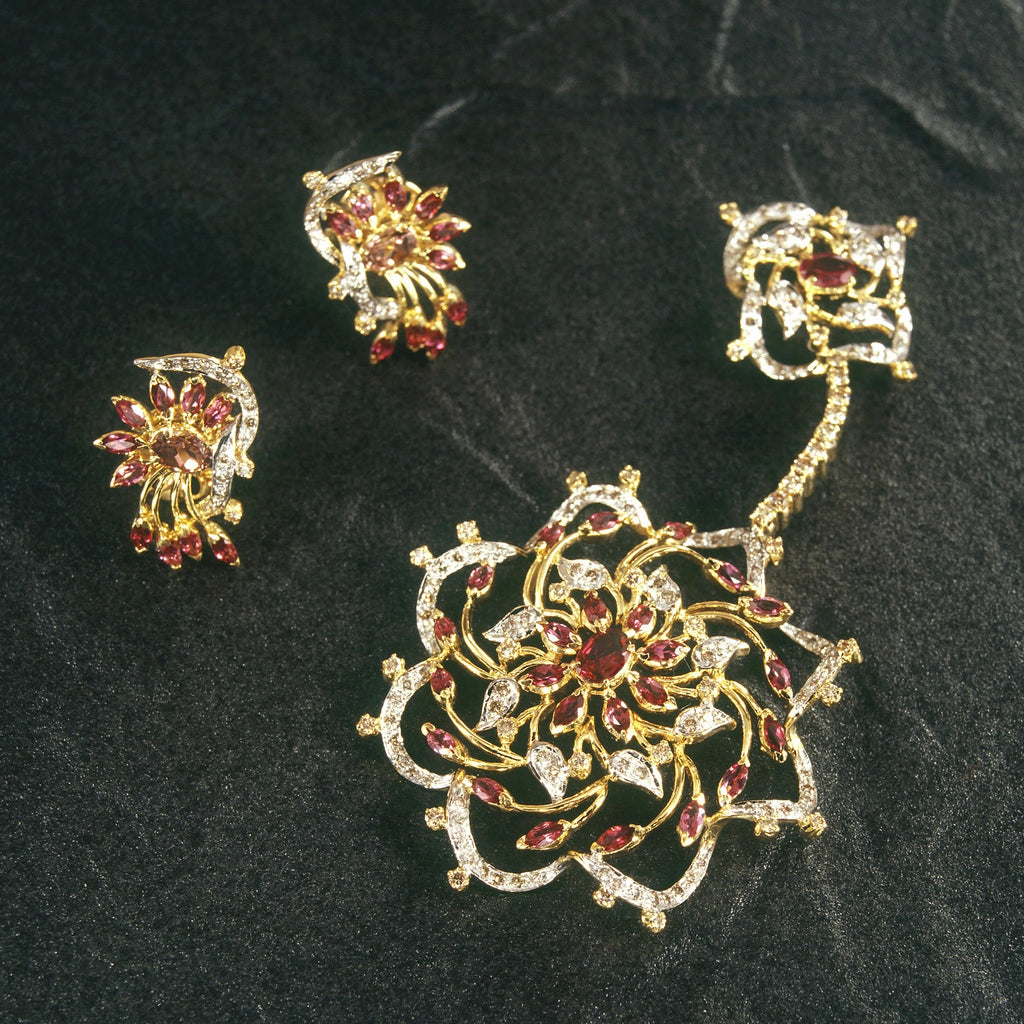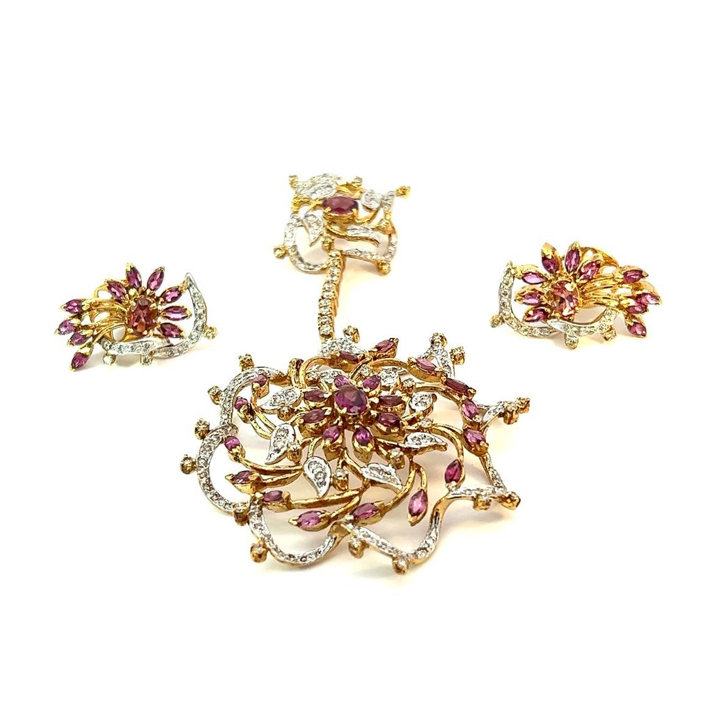 18K Yellow White Gold Pendant Earring Set with Natural Diamond & Rhodolite Jewellery