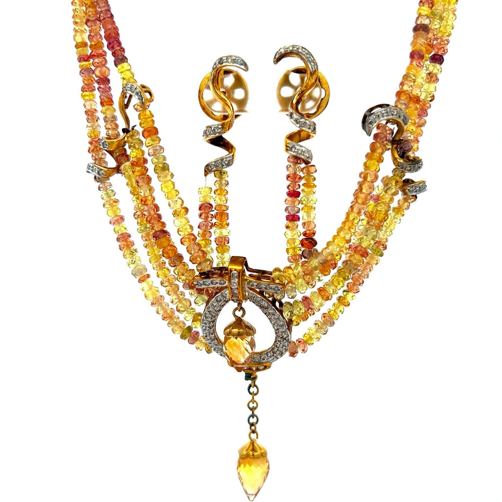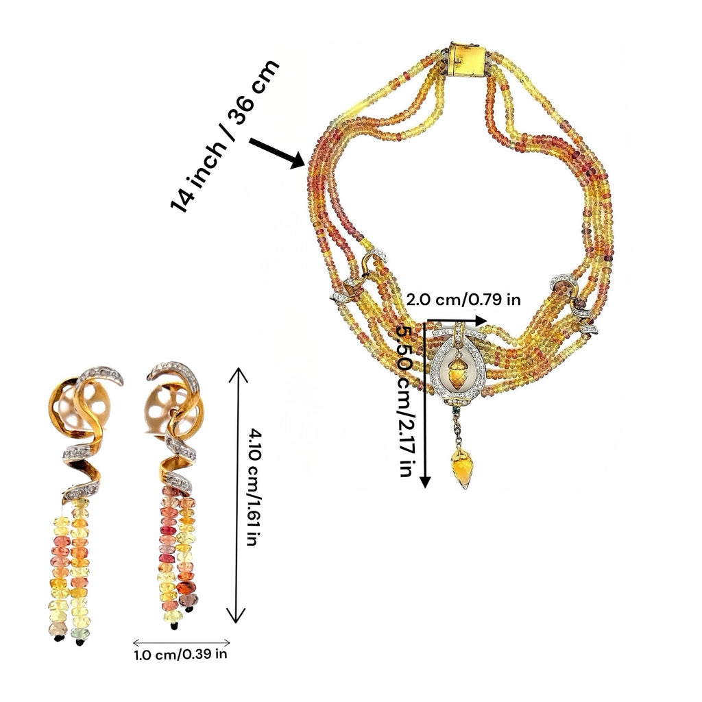 Inspired by the hues of a glowing sunset, this 9K Yellow Gold Necklace and Earring Set features natural diamonds paired with cascading ombre sapphire beads. The design showcases a graceful blend of sapphire shades—from soft yellows to deep oranges and reds—capturing the warmth of twilight.