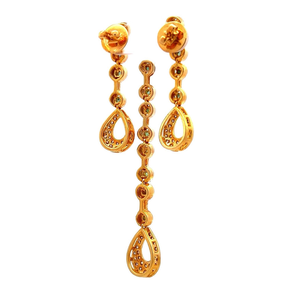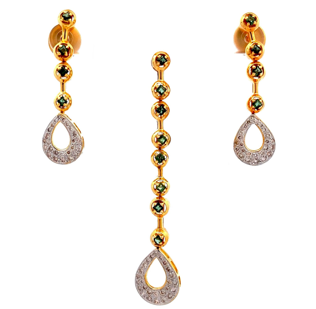 18K Two Tone Gold Natural Diamond & Green Tourmaline Pendant Earring Set Jewelry