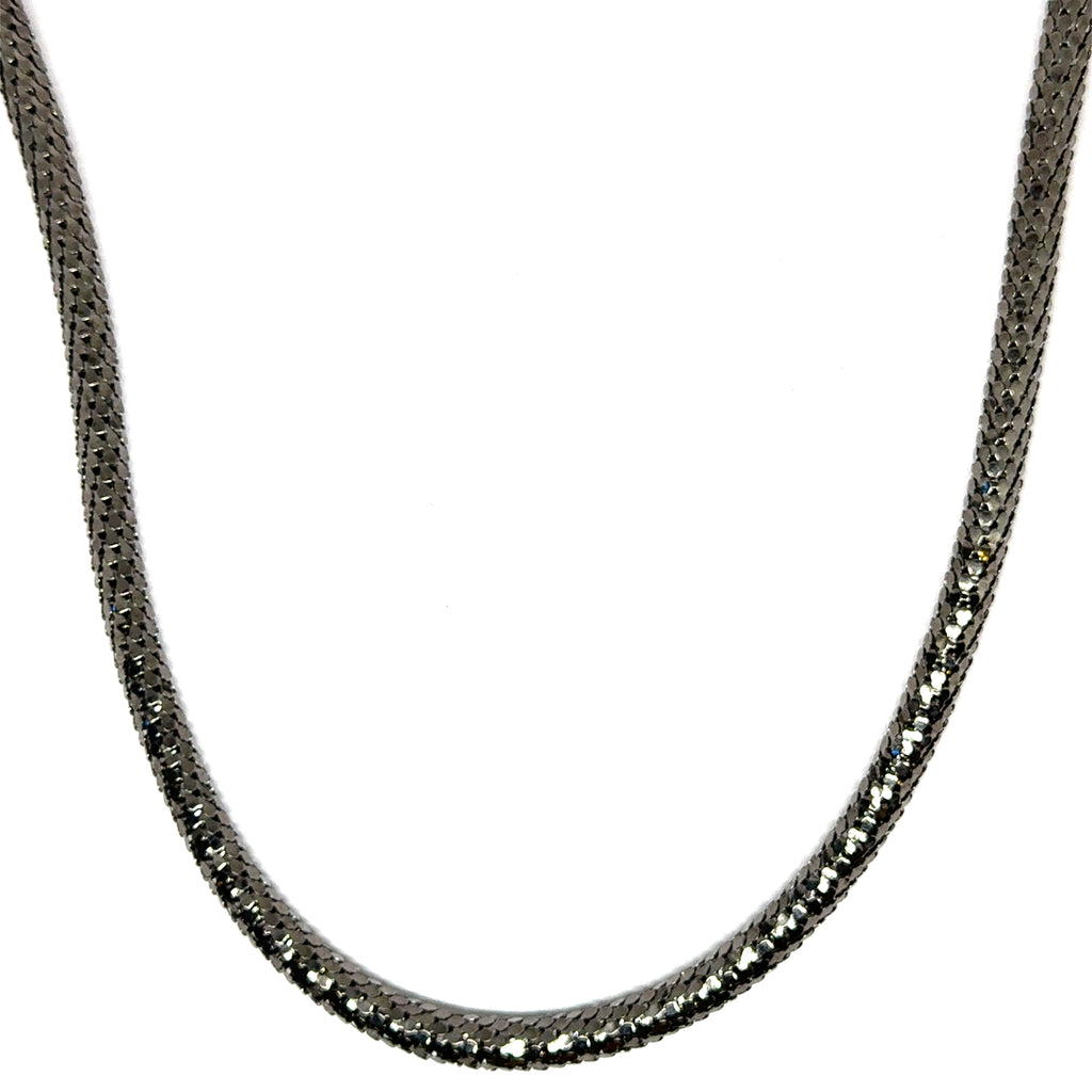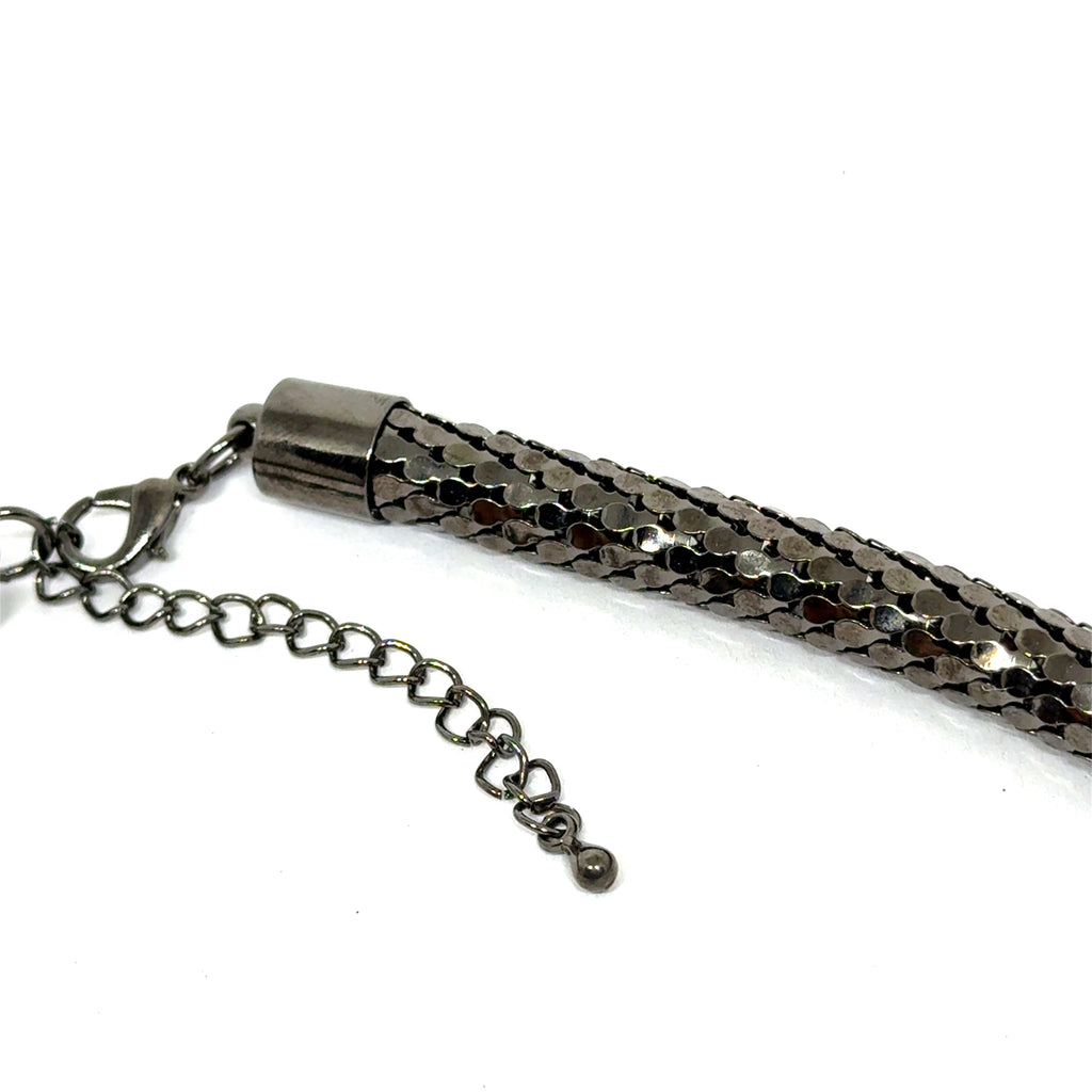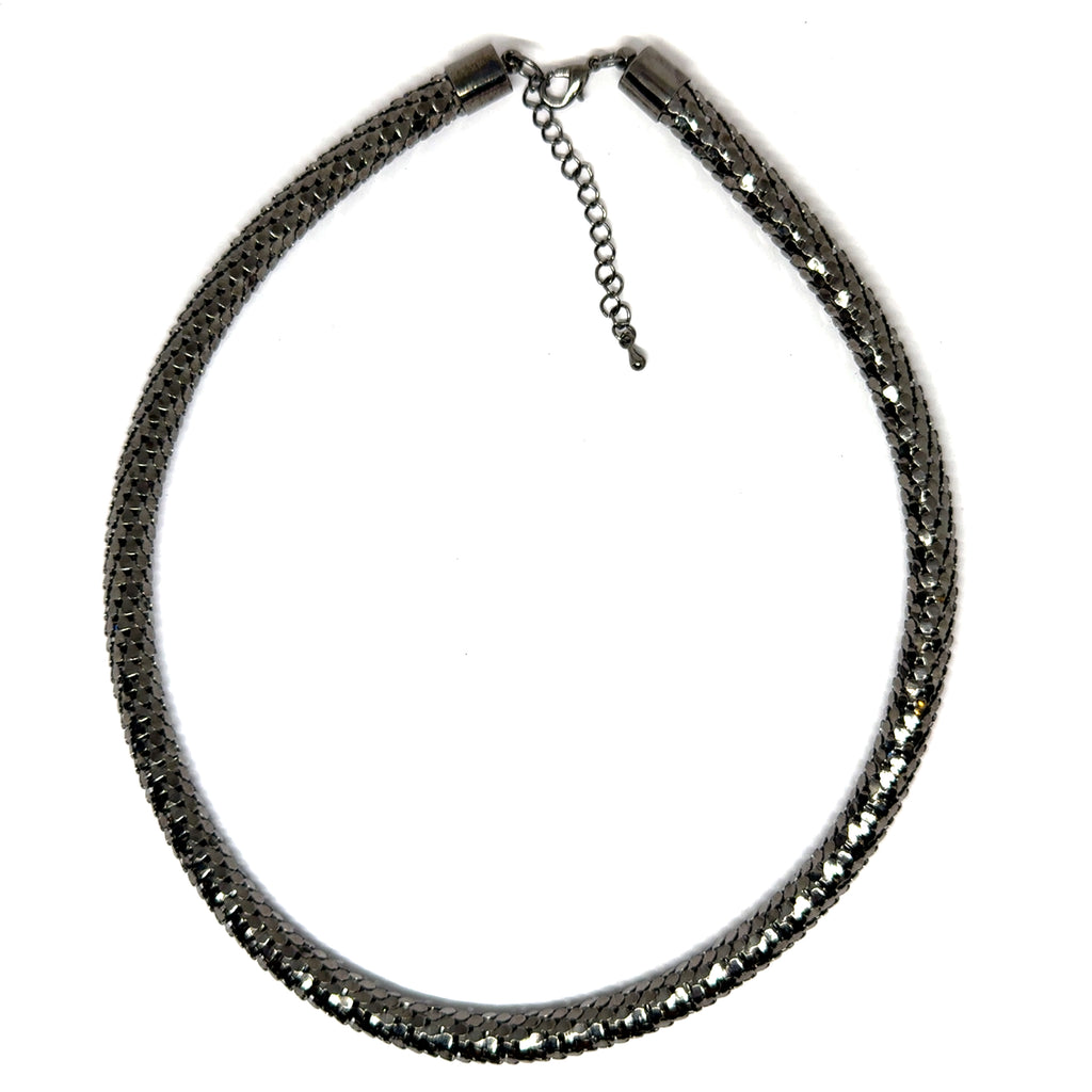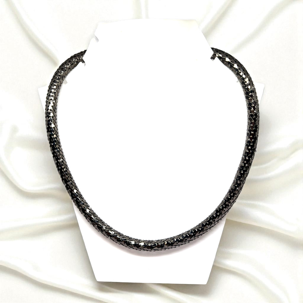 Channel edgy elegance with this gunmetal black snake scale tube necklace, crafted for a modern industrial aesthetic. The reflective scale-textured mesh adds drama and depth, making it the perfect statement piece for nightwear, urban fashion looks, or concert-ready outfits.