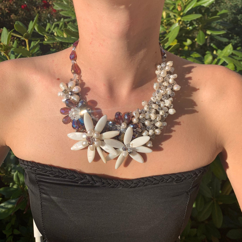 Handmade Choker Gleaming White 20" Unique Sea Shells with Pearls Floral Necklace